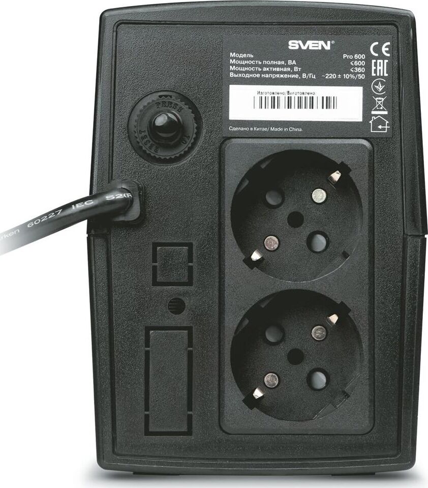 Тип ИБП линейно-интерактивный, Тип нагрузки:компьютер, монитор, Мощность полная, ВА:600, Мощность активная, Вт:360, Максимальная нагрузка, Вт 360, Уровень входного напряжения, В:~165 – 275, Уровень выходного напряжения, В: ~220 ± 10 %, Форма выходного напряжения: апроксимированная синусоида, AVR (авторегулятор напряжения), Входная частота, Гц: 50, Рабочая частота, Гц: 50 ± 1 % (в режиме работы от батареи), Входная вилка: 1 х СЕЕ7/4, Выходные розетки, шт: 2 х СЕЕ7/4, Защита: от короткого замыкания, импульсных и высокочастотных помех; тепловая защита трансформатора, Типовое время переключения, мс: 10.