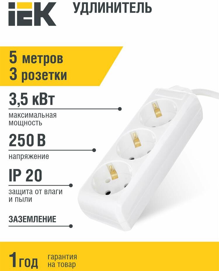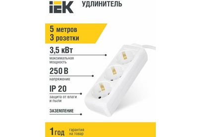 IEK Сетевой удлинитель У03 5м (3 розетки) белый (пакет ПЭ)