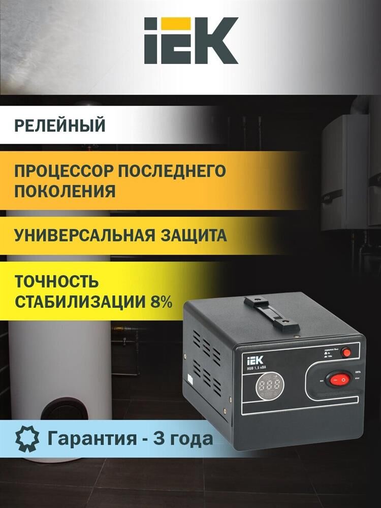 Тип стабилизации: релейная. Тип сети: однофазная. Рабочая частота сети: 50 Гц. Номинальная мощность: 1.2. Максимальная мощность: 1.32. Полная мощность: 1.5. Особенности: Релейные стабилизаторы напряжения IEK предназначены для поддержания стабильного однофазного напряжения питания нагрузок бытового и промышленного назначения (220В, 50Гц) при отклонениях сетевого напряжения в широких пределах по значению и длительности. Климатическое исполнение УХЛ4.. Охлаждение: естественное, воздушное. Класс защиты корпуса: IP20. Цвет: черный. Вес товара: 4.22. Габариты упаковки (ед) ДхШхВ: 0.3x0.22x0.2. Вес упаковки (ед): 4.56. Гарантия: 36 мес.. Входное напряжение: от 140 до 260 В. Выходное напряжение: 220 В ± 8%. Коэффициент полезного действия (КПД): 90%. Высоковольтная защита: 243В ± 4В. Время задержки: 20 мс. Рабочая температура: до 40 °С. Размеры (ШхВхГ): 19 х 15 х 23.5 см. Рабочая влажность воздуха: не более 90%. Охлаждение: естественное, воздушное. Мощность на выходе, номинальная: 1.2 кВт. Сеть: однофазная. Время заде