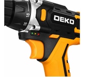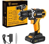 Аккумуляторная дрель-шуруповерт DEKO Banger 20V ONE + 1х1.5Ah используется при строительных, слесарно-монтажных работах. Помогает быстро высверливать отверстия нужного диаметра как на деревянной, так и металлической поверхности, быстро вкручивать или извлекать крепеж. Технические характеристики: Размер зажимаемой оснастки: 0,8-10 мм Макс. диаметр сверления (дерево/металл): 28/10 мм Обороты, 1-я/2-я скорость: 0-350/0-1350 об/мин Число ступеней крутящего момента: 18+1 Комплектация: 1 шт дрель-шуруповерт 1 шт АКБ 1 шт зарядное ус-во 1 шт бита