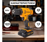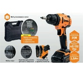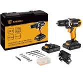 Аккумуляторная дрель-шуруповерт DEKO Banger 20V ONE + BMC, 2x1.5Ah + 63 tools используется при строительных, слесарно-монтажных работах. Помогает быстро высверливать отверстия нужного диаметра как на деревянной, так и металлической поверхности, быстро вкручивать или извлекать крепеж. Технические характеристики: Размер зажимаемой оснастки: 0,8-10 мм Макс. диаметр сверления (дерево/металл): 28/10 мм Обороты, 1-я/2-я скорость: 0-350/0-1350 об/мин Число ступеней крутящего момента: 18+1 Комплектация: 1 шт дрель-шуруповерт 2 шт АКБ 1 шт зарядное ус-во 6 шт биты 6 шт сверла 1 шт магнитный держатель 50 шт набор крепежа 1 шт руководство по эксплуатации 1 шт кейс