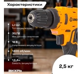18В, Аккумулятор Li-ion,2 Ач, Максимальный крутящий момент, 35 Нм, 0-350; 0-1300; Число ступеней регулировки момента 20+1; Максимальный диаметр сверления в древесине 30 мм; Максимальный диаметр сверления в стали 10 мм; Быстрозажимной патрон; Асинхронный двигатель; ударный; в комплекте 2 аккумулятора