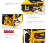 Max мощность, кВт: 3.3. Вид топлива: бензин Аи92. Выход 12V: нет. Датчик масла: есть. Евро разъём Schuko 230V/16А: нет. Индикатор уровня топлива: есть. Контроль напряжения: AVR. Тип двигателя: 4-х тактный. Тип электростанции: мобильные. Уровень шума, дБ: 72. Эл. выходы 380/220/12, шт: -/1/-. Мощность номинальная при 220 В, кВт: 3. Напряжение, В: 220. Стартер: ручной. Альтернатор: синхронный. Автозапуск (АВР): нет. Емкость топливного бака, л: 15. Вес, кг: 47.
