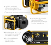 3000/2800Вт;208см3; 370 г/кВт.ч;15,0/0,6л;12В/8,3А; 3200об/мин, 4-х тактный, одноцилиндровый с воздушным охлаждением; ручной стартер; бензин АИ-92