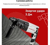 Профессиональный мощный трехрежимный сетевой перфоратор класса SDS plus для проделывания отверстий в бетоне, кирпиче, камне. Рекомендуется для бурения отверстий большого диаметра или глубоких отверстий, в том числе проходных и отбойных работ. Оснащается дополнительной рукояткой с ограничителем глубины бурения. Тип хвостовика - SDS-plus. Номинальная потребляемая мощность - 900Вт. Параметры сети питания, В/Гц220 ±10% / 50. Номинальная энергия удара - 3,3Дж. Частота вращения на х/х - 0-1050 об/мин. Частота ударов на холостом ходу - 0-5100 уд/мин. Регулировка оборотов - Есть. Поддержание оборотов - Нет. Количество режимов - 3. Режим сверления - Есть. Реверс - Есть. Режим долбления (без вращения инструмента) - Есть. Мах диаметр сверления/бурения бетона - 30 мм. Мах диаметр сверления/бурения коронкой кирпича - 68 мм. Предустановка углового положения инструмента - Есть. Предохранительная муфта - Есть. Масса согласно процедуре EPTA 01/2003 - не более 2,9 кг. Кейс - Да. Габариты без упаковки - 380х210х95 мм.