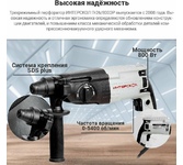 Макс. количество ударов, уд/мин 5500 Частота вращения, об/мин 0-1300, Количество режимов работы 3, Сила удара, Дж 2.9, Макс. диаметр сверления в бетоне, мм 26, Тип патрона SDS+/QCC, Потребляемая мощность, Вт 820, Наличие реверса, Система защиты оператора, Защита от пыли, Прорезиненная рукоятка, Прорезиненный морозостойкий кабель,