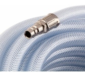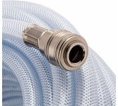 Шланг пневматический армированный прозрачный Stels 57027 из ПВХ, диаметром 10 х 16 мм и длиной 30 м, с быстросъемными соединениями, выдерживает давление до 18 бар. Предназначен для соединения между собой мощных компрессоров и инструментов с пневматическим приводом, а также прокладки магистральной пневмолинии. Шланг подойдет для использования на производственном предприятии, строительной площадке или в автосервисе.ПреимуществаКачественное исполнение — шланг изготовлен из ПВХ и имеет армирующий слой из полиамида, поэтому характеризуется высокой прочностью и устойчивостью к падениям и пережатиям, а также невосприимчивостью к химическим воздействиям.Долговечность — антикоррозийное никелевое покрытие защищает стальные штуцер и муфту от разрушения, рукав увеличенной толщины отличается высокой прочностью.Быстрая подготовка к работе — соединения типа «рапид» упрощают подключение шланга к компрессору и пневматическим инструментам.Комфортная работа — шланг длиной 30 м позволяет мастеру беспрепятственно перемещаться по