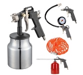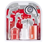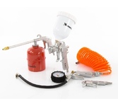 Универсальный набор изготовлен из высококачественного материала. Используется для покрасочных, промывочных, продувочных работ, а также для подкачки шин. Применяется как в бытовых (гаражи, домашние мастерские), так и в профессиональных (автосервисы, мебельное производство, мелкие фасадные работы) условиях. Подходит ко всем видам пневматических компрессоров. Имеет в комплекте шланг длиной 5 метров с коннектором для быстросъемного соединения. Комплектация: пистолет для накачивания с манометром пистолет продувочный пистолет для вязких жидкостей краскораспылитель с верхним бачком шланг с быстросъемным коннектором