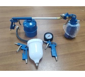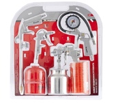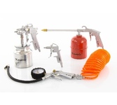 Универсальный набор изготовлен из высококачественного материала. Используется для покрасочных, промывочных, продувочных работ, а также для подкачки шин. Применяется как в бытовых (гаражи, домашние мастерские), так и в профессиональных (автосервисы, мебельное производство, мелкие фасадные работы) условиях. Подходит ко всем видам пневматических компрессоров. Имеет в комплекте шланг длиной 5 метров с коннектором для быстросъемного соединения. Комплектация: пистолет для накачивания с манометром пистолет продувочный пистолет для вязких жидкостей краскораспылитель с нижним бачком шланг с быстросъемным коннектором