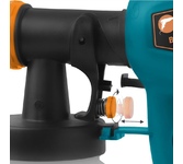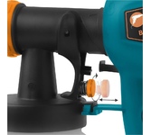 Потребляемая мощность 400 Вт, Вес брутто 1,8 кг, Производительность 0,38 л/мин, Габариты упаковки 30,5x13,5x27,5 см, Емкость бачка 900 мл, HVLP- технология, Регулировка скорости, Длина шнура питания 1,8 м, Набор аксессуаров: Чашка-вискозиметр (1 шт), Емкость для краски (1 шт), Игла (1 шт), Клапан (1 шт), Сопло (1 шт).
