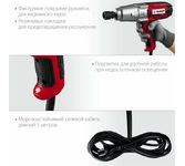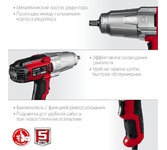 Тип инструмента: Ударный гайковерт. Крутящий момент: 350. Количество скоростей: двухскоростной. Тип основного патрона: квадрат 1/2". Тип электропитания: от электросети. Жесткий кейс в комплекте: есть. Особенности: Гарантийный срок составляет 24 мес. со дня продажи. Расширенная гарантия 60 мес. предоставляется только при условии, регистрации в течении 1 мес. с покупки на сайте www.resanta.ru. Вес товара: 4.85. Длина инструмента: 385. Высота инструмента: 305. Комплект поставки: Гайковерт, кейс, набор торцевых головок (17 мм., 19 мм., 21 мм., 22 мм.), паспорт.. Номинальная потребляемая мощность: 1100. Габариты упаковки (ед) ДхШхВ: 0.37x0.12x0.31. Вес упаковки (ед): 3.38. Гарантия: 24 мес.. Число оборотов: 2500 об/мин. Обороты: 2500 об/мин , скоростей двухскоростной. Основной патрон: квадрат 1/2". Вес: 4.85 кг. Крутящий момент: 350 Н*м