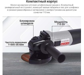 Экономичная, простая в эксплуатации модель для уверенной работы в том числе в стесненных условиях и над головой. Инструмент способен выполнить задачи по резке, зачистке, шлифованию поверхностей из металла, Возможность удержания инструмента одной рукой благодаря небольшому весу и компактной конструкции корпуса. Уменьшенный корпус редуктора позволяет выполнить более глубокий рез. Блокировка шпинделя обеспечивает быструю смену оснастки и повышает производительность труда. Дополнительная двухпозиционная рукоятка наклонена к корпусу редуктора для повышения удобства рабочего процесса. Безопасный двухполюсный включатель с фиксацией облегчает работу в непрерывном режиме и обеспечивает мгновенное отключение инструмента одним нажатием при необходимости. Металлический защитный кожух легко переставляется и обеспечивает безопасность труда. Применение в конструкции четырех усиленных подшипников, конические шестерни редуктора с поверхностным упрочнением и бронированный ротор гарантируют достаточную прочность даже при интенс