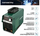 (MMA), сеть 220±15%В, ПН MMA-60%, частота 50/60 Гц, класс защиты IP21S, класс изоляции F, диаметр электродов 1,6-4.0мм, мощность 4.9кВт, масса 4.0 кг, размеры 315х150х285мм, гарантия 36мес.