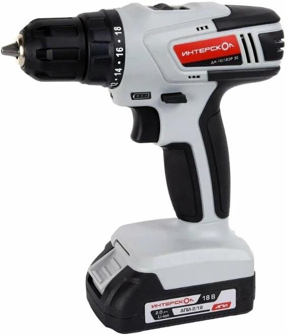 INTERSKOL Аккумуляторная дрель-шуруповерт ДА-10/18ЭР 35 ПРОМО, 18В, 1400 об/мин, с 2 АКБ 2 Ач и ЗУ И