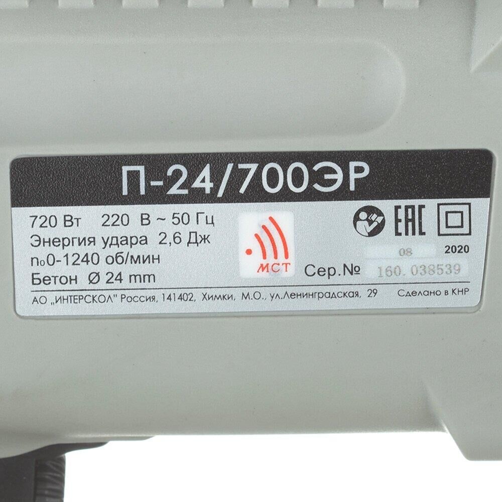 Параметры сети питания, В/Гц: 220±10%/50. Номинальная потребляемая мощность, Вт: 720. Номинальный потребляемый ток, А: 3,3. Частота вращения на холостом ходу, об/мин: 0-1240. Частота ударов на холостом ходу, уд/мин: 0-5080. Номинальная энергия удара, Дж: 2,6. Наибольший диаметр бурения (сверления) в бетоне, мм: 24. Наибольший диаметр бурения (сверления) в стали, мм: 13. Наибольший диаметр бурения (сверления) в древесине, мм: 24. Наибольший диаметр бурения (сверления) коронкой в кирпиче, мм : 68. Возможность регулировки числа оборотов. Изменение направления вращения инструмента. Режим сверления. Режим долбления (без вращения инструмента). Предохранительная муфта. Поддержание оборотов. Предустановка углового положения инструмента. Система крепления инструмента: SDS-Plus. Класс безопасности машины (по ГОСТ Р МЭК 60745-1): II. Масса, кг: 2,9.
