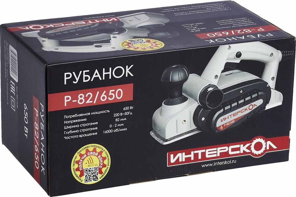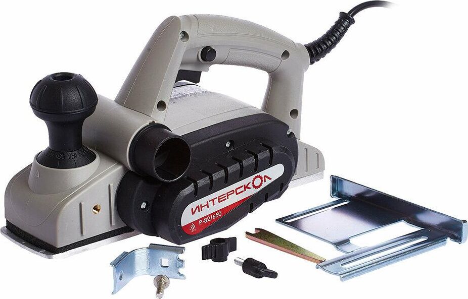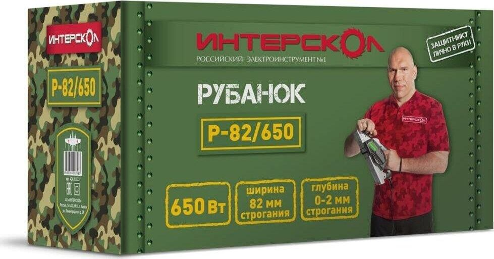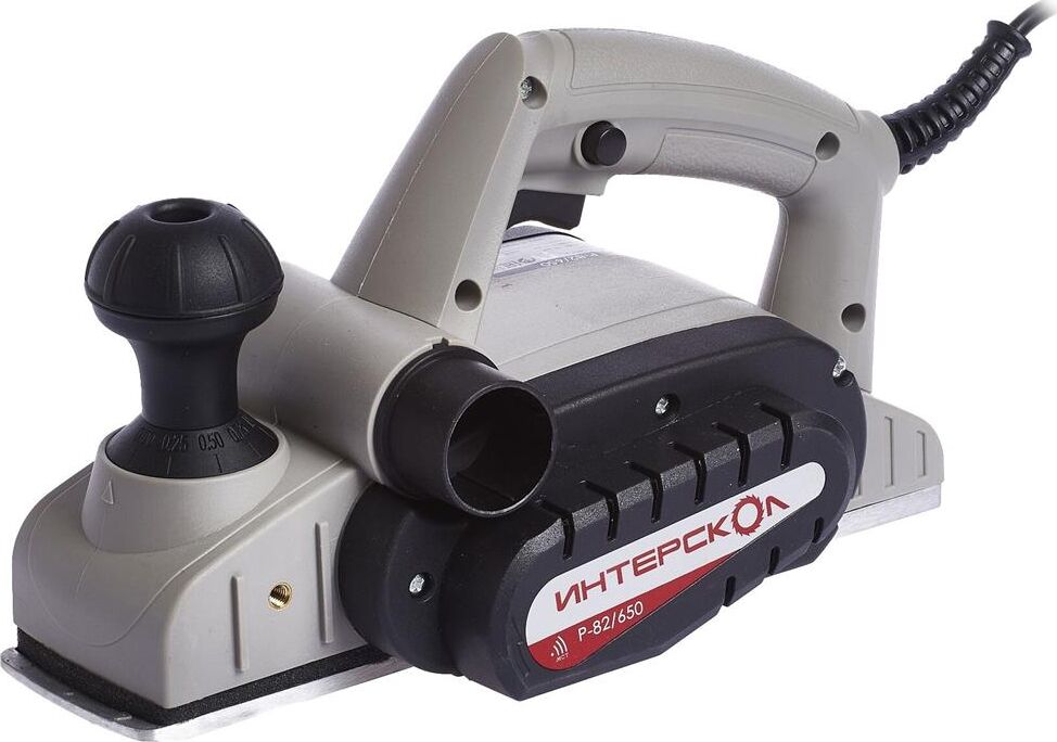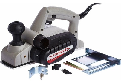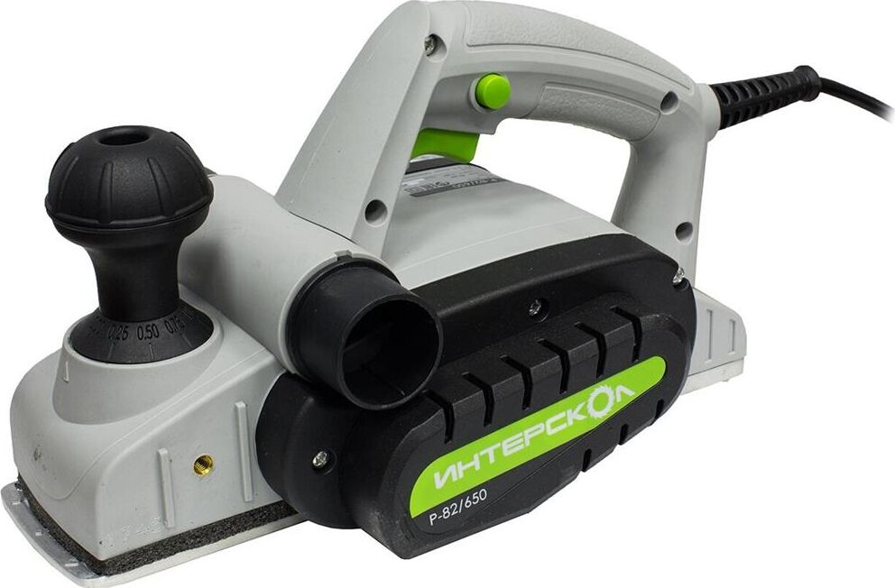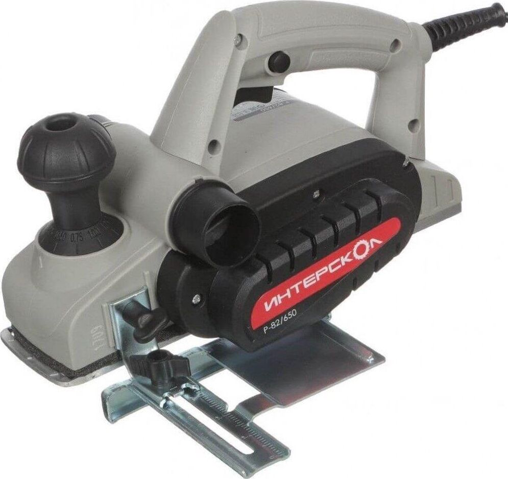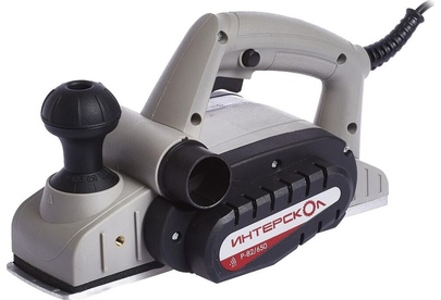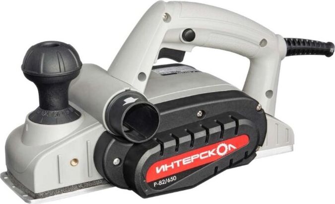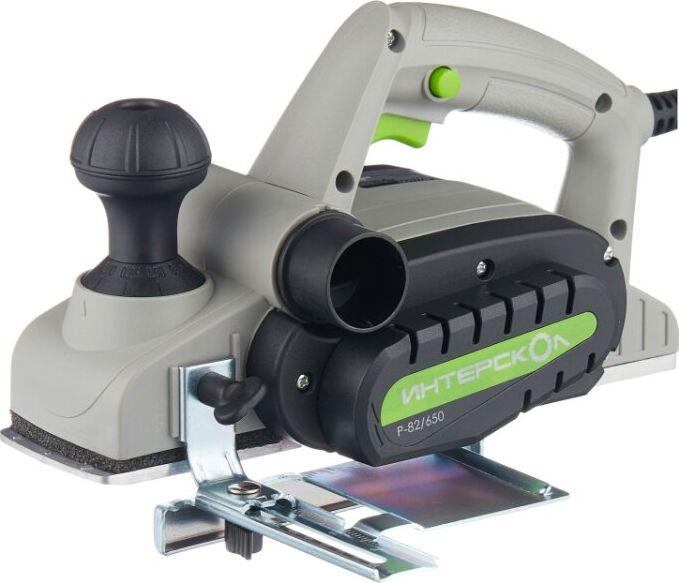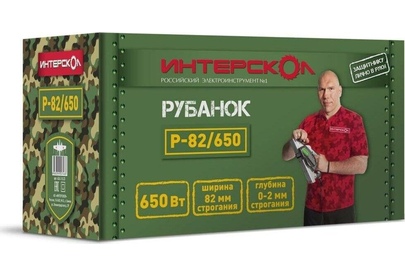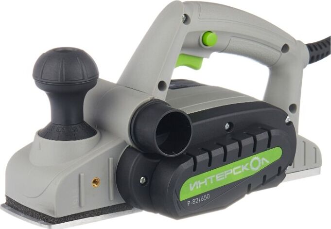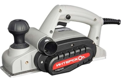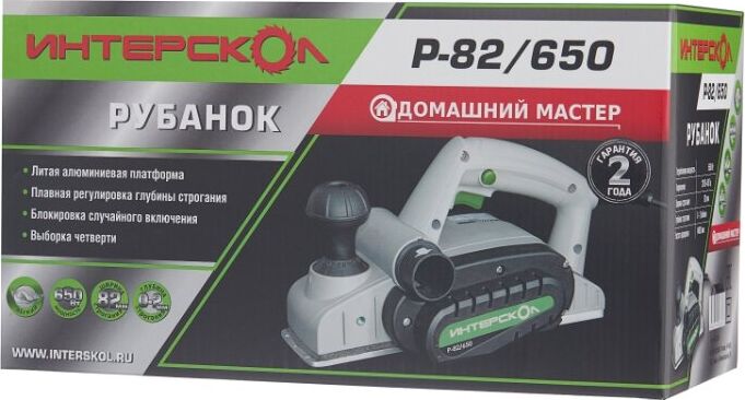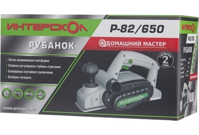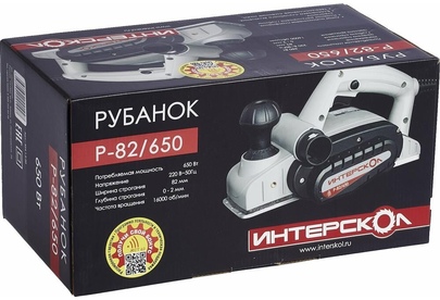 Глубину строгания можно регулировать поворотом передней рукояти в диапазоне 0-2 мм. Клавиша "Пуск" блокируется для безопасной эксплуатации электроинструмента. Подошва оснащена тремя V-образными пазами для вытачивания скошенных кромок (фаски) различной глубины. Подключение пылесоса возможно как с левой, так и с правой стороны. Технические характеристики Интерскол Р-82/650 424.3.0.00 Вес, кг 2,7. Мощность, Вт 650. Ширина обработки, мм 82. Длина кабеля, м 2. Регулировка глубины строгания. Выборка четверти.Габариты, мм 300х160х180.Глубина строгания, мм 0-2. Мах глубина выборки четверти, мм 9. Число оборотов, об/мин 16000.