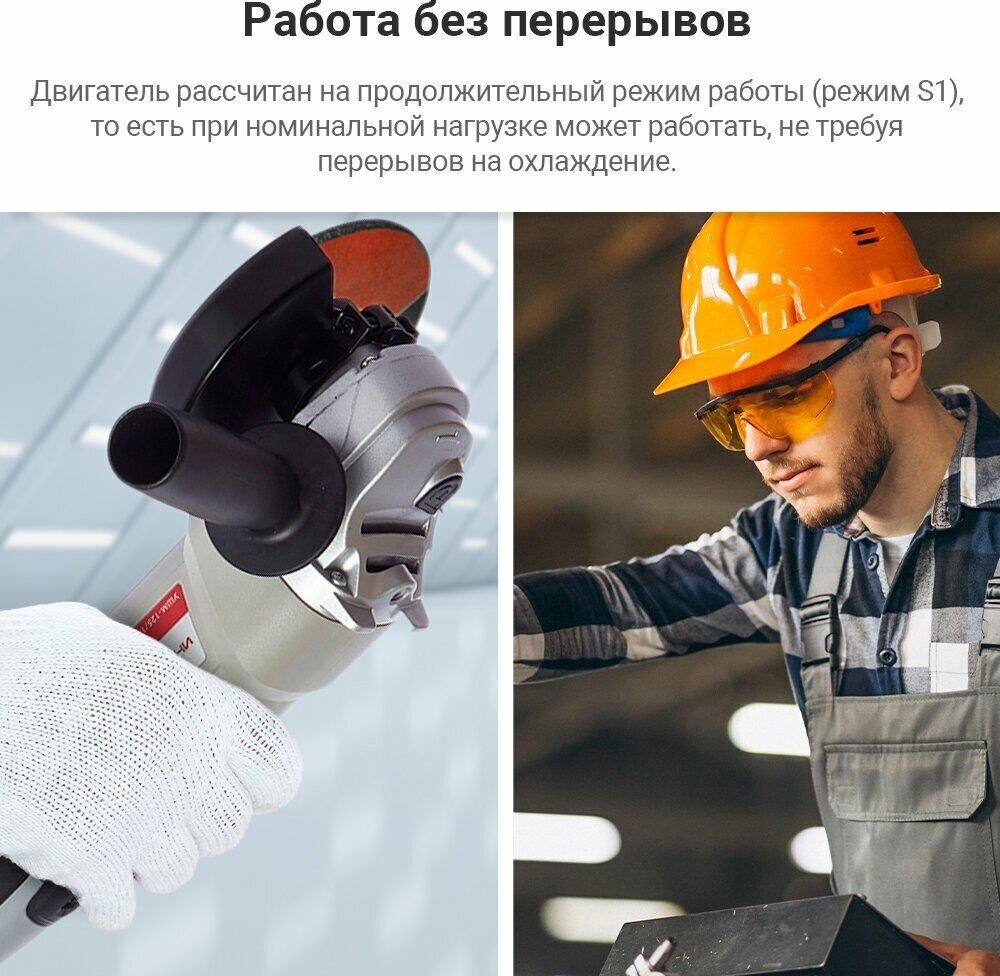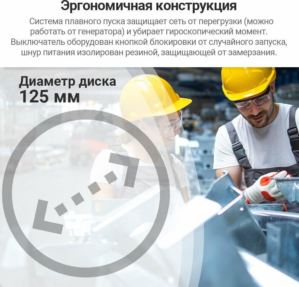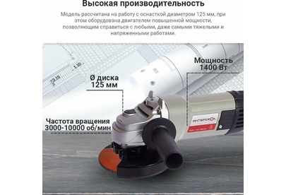 Параметры сети питания, В/Гц: 220 ±10% / 50, Номинальная потребляемая мощность, Вт: 1400, Номинальный потребляемый ток, А: 6,4, Максимальный O диска, мм: 125, Диаметр посадочного отверстия шлифкруга, мм: 22, Длина резьбы шпинделя, мм: 14, O резьбы шпинделя, мм: М14, Частота вращения шлифовального круга на холостом ходу, об/мин: 3000…10000, Маркированная рабочая скорость, м/с, не менее: 80, Плавный пуск, Ограничение пускового тока, Регулировка оборотов, Защита от повторного включения, Поддержание оборотов, Защита от перегрузки, Защита от заклинивания, Класс безопасности машины по ГОСТ12.2.013.0-91: II, Установленный срок службы, лет: 3, Масса, кг: 2,2.