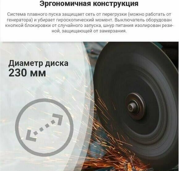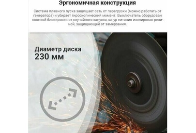 Источник питания: сеть 220V Тип двигателя: щеточный Потребляемая мощность, Вт: 2400 Диаметр диска, мм: 230 Диаметр посадочного отверстия, мм: 22.2 Резьба шпинделя: М14 Тип крепления диска: Быстрозажимная гайка SDS Min число оборотов, об/мин: 6500 Max число оборотов, об/мин: 6500 Уровень звуковой мощности, дБ (А): 106 Уровень вибрации, м/с²: 6 Регулировка оборотов: нет Особенности: Блокировка шпинделя, Быстрая замена угольных щеток, Плавный пуск Длина кабеля, м: 2.5