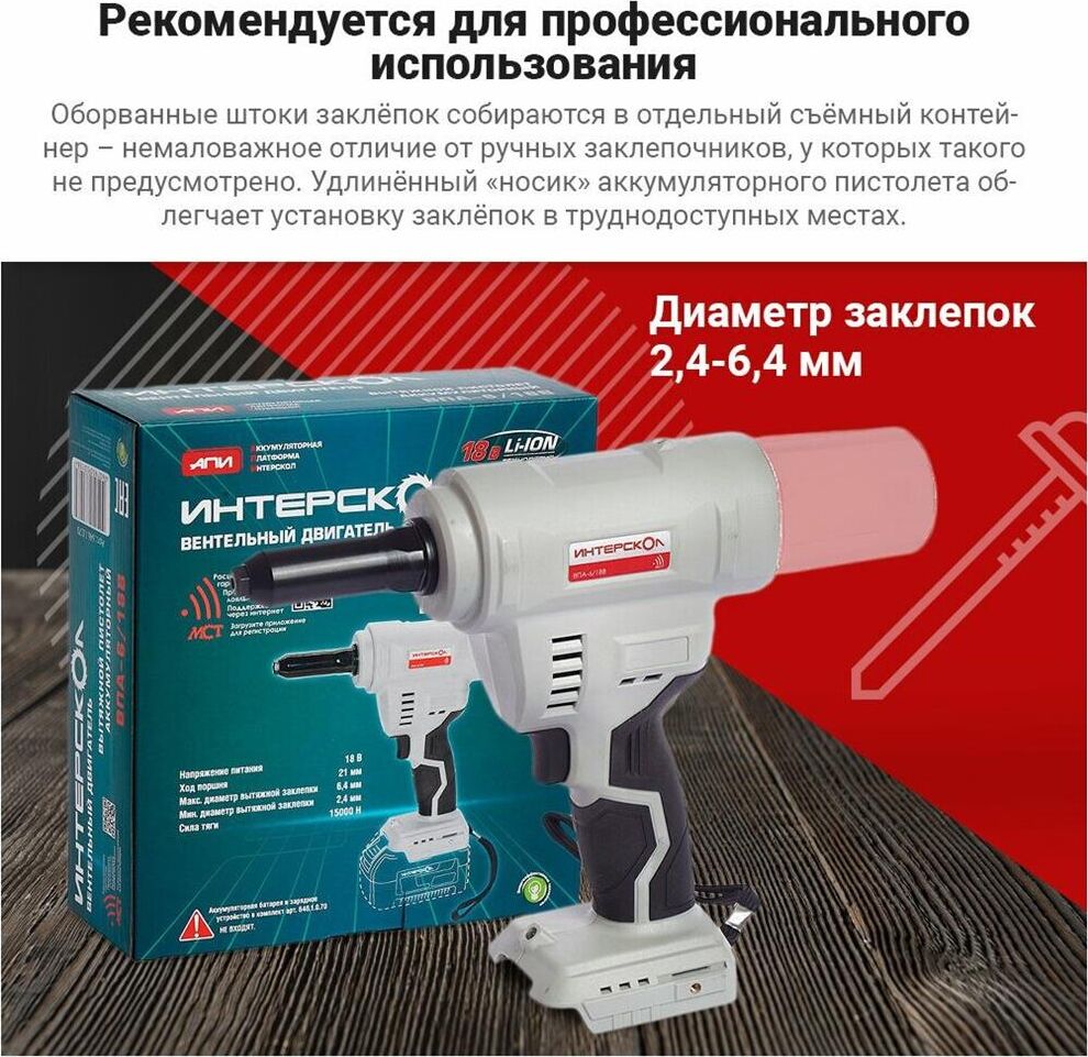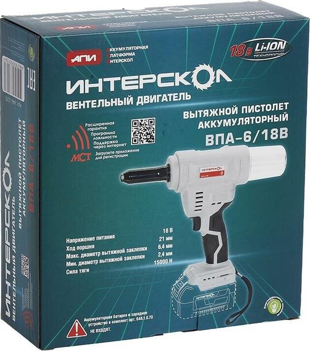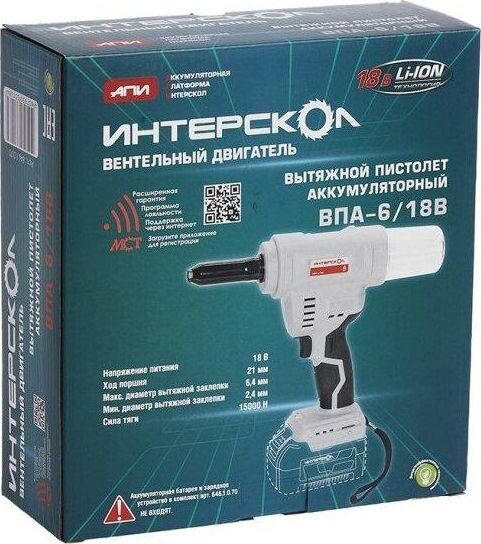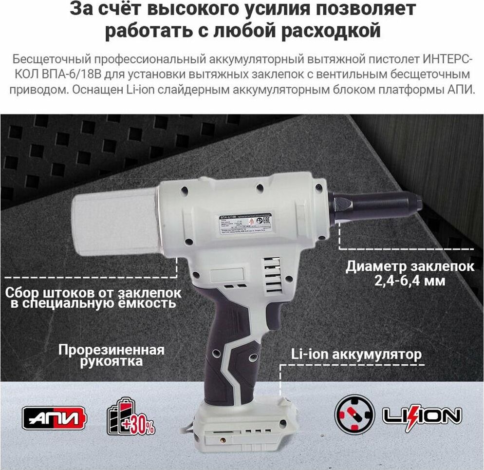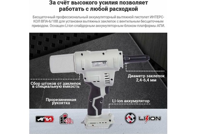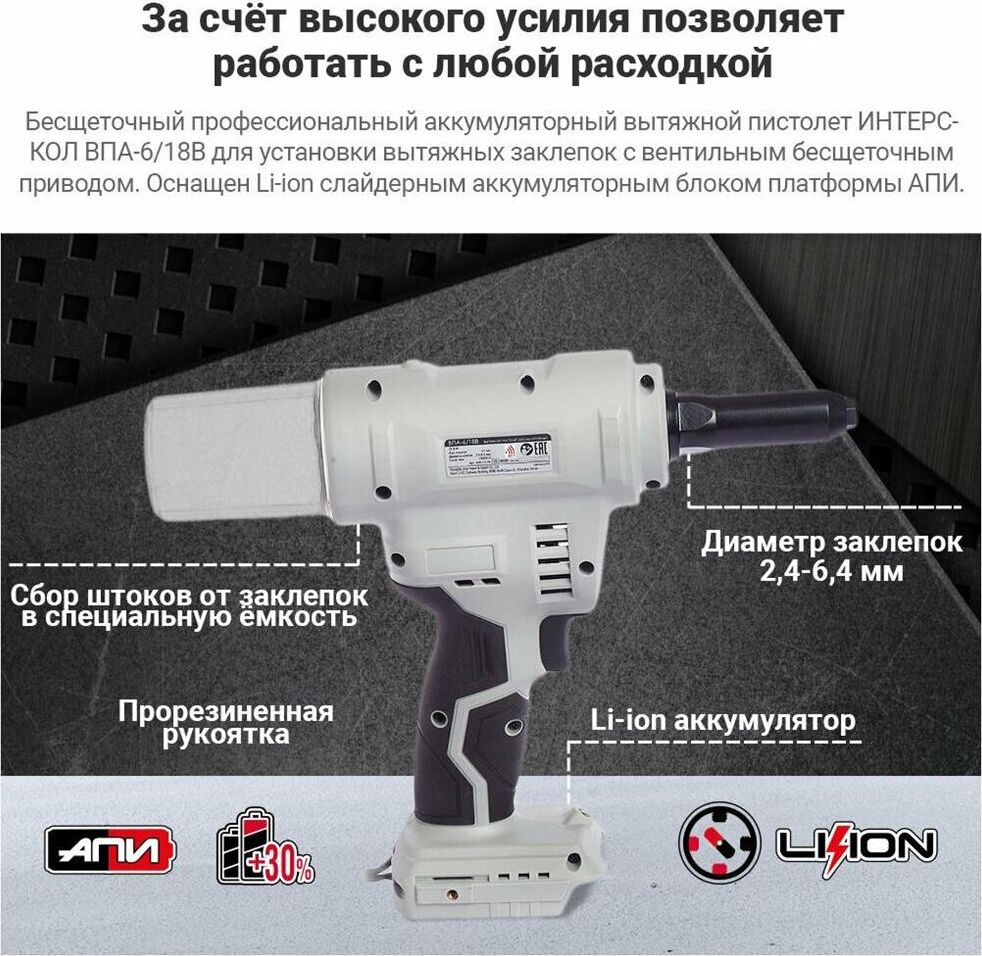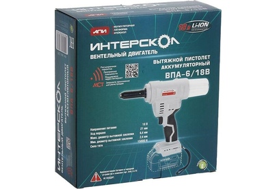 ИНТЕРСКОЛ ВПА-6/18В бесщеточный аккум. вытяжной пистолет Li-ion АПИ (картон, без аккум., ЗУ)