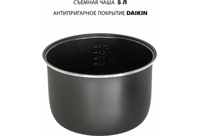 Мультиварка, объем чаши: 5л, мощность: 860 Вт, электронное управление, цифровой светодиодный дисплей, чаша с антипригарным покрытием: Daikin, количество автоматических программ: 11, количество программ ручной настройки: 145, функция "МУЛЬТИПОВАР", функция "СМАРТШЕФ плюс", термоизолированный корпус, поддержания температуры: до 12 часов, отложенный старт: до 24 часов