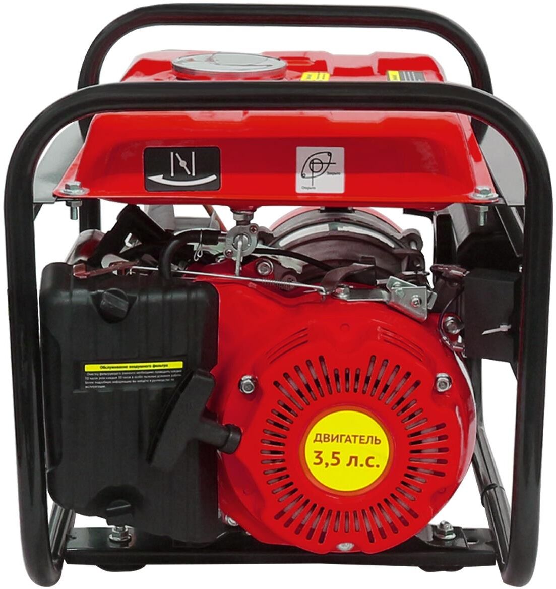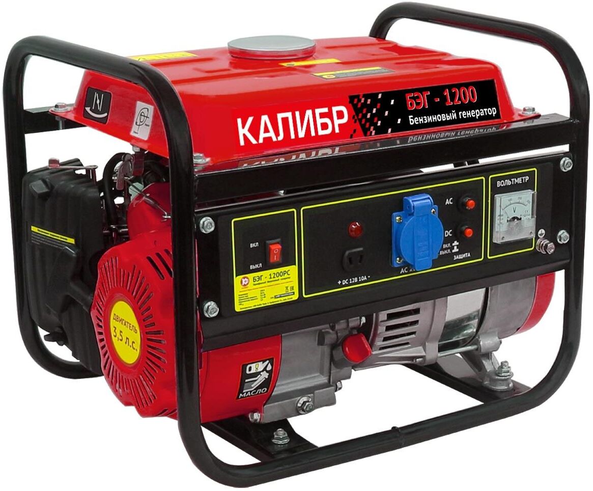 Переносной бензиномоторный электроагрегат с двигателем внутреннего сгорания Калибр БЭГ-1200 предназначен для автономного энергоснабжения,в повторно-кратковременном режиме,потребителей бытовых электроприборов со стандартными характеристиками сети переменного тока: напряжение – 220В,частота – 50Гц.Двигатель работает на неэтилированном бензине АИ- 92.Он оснащён мембранным карбюратором и электронной системой зажигания.Для запуска двигателя служит ручной стартёр.вырабатывает постоянный ток напряжением 12В для зарядки кислотных аккумуляторов; индикатор уровня топлива; электронная система зажигания; ручной стартёр.Характеристики,Модель двигателя 154F,Тип 1 цилиндровый,4-х тактный,Способ охлаждения,Воздушный принудительный,Мощность 3,5 л.с.Объём топливного/масляного бака 5,0 /0,36 л,Номинальное число оборотов 3600 об/мин,Число оборотов на холостом ходу 3000 об/мин,Стартёр ручной,Тип топлива бензин АИ-92 (неэтилированный),Тип масла SAE 5W-30/ SAE 10W-30,Тип зажигания электронное бесконтактное магнето,Генератор,Напряже