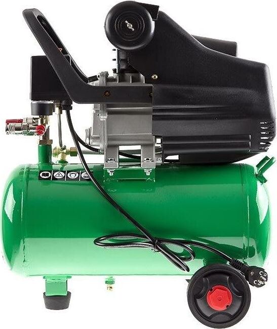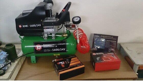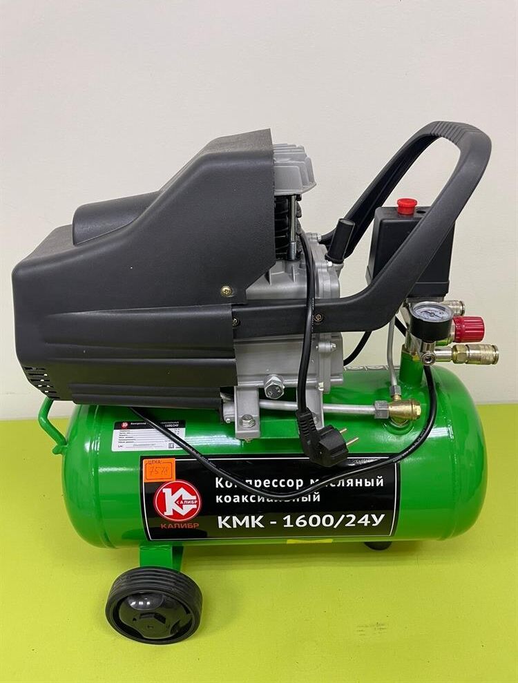Компрессор масляный коаксиальный Калибр КМК-1600/24У предназначен для обеспечения оборудования, аппаратуры и инструмента, применяемого в бытовых целях, сжатым атмосферным воздухом. Использование компрессора позволяет значительно сэкономить электроэнергию, механизировать труд и повысить качество работ, за счёт подключаемого пневмоинструмента. Компрессор не предназначен для промышленного использования и строительных работ. Характеристики Напряжение питания 220 В, Частота 50 Гц, Номинальная мощность двигателя ,1600 Вт Количество оборотов 2850 об/мин,Двигатель асинхронный, Производительность (по всасыванию) 198 л/мин, Рабочее давление сжатого воздуха0.8 МПа/8 бар ,Количество ступеней 1, Число цилиндров компрессора 1 ,Объём ресивера24 л, Тип смазочного масла залитого производителем L-DAB 46, Габариты ДхШхВ 530х245х590 мм, Вес (брутто/нетто) 20.0/18.0 кг