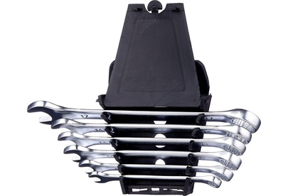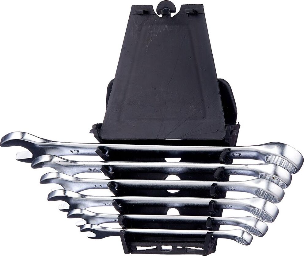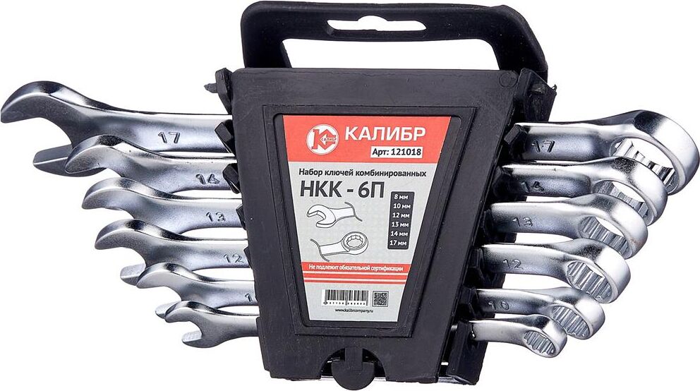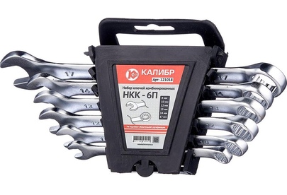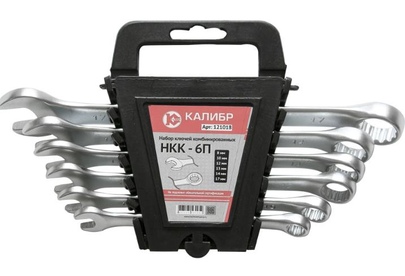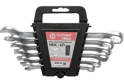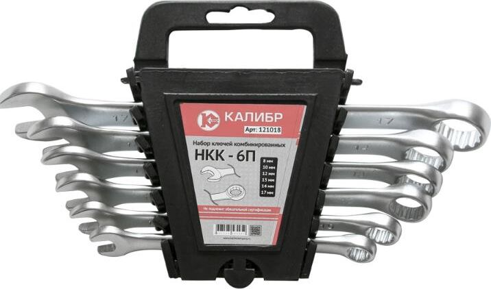 Набор ключей комбинированных Калибр НКК-6П, арт.121018 состоит из 6 предметов. Каждый ключ изготовлен из высокопрочной CrV стали. Для удобства хранения набор комплектуется пластиковым подвесом. Инструмент сочетает в себе функции накидного и рожкового гаечного ключа. Ключи: 8, 10, 12, 13, 14, 17