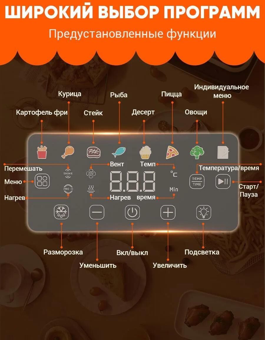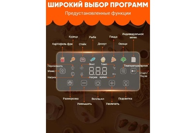 Цвет товара серебристый Мощность 2000 Вт Тип: аэрогриль/аэрофритюрница Тип нагревательного элемента ТЭН Объем чаши 7 л Количество автоматических программ 8 Максимальное время установки таймера 1 ч Регулировка температуры да Тип крышки: на кронштейне Особенности: поддержание тепла, таймер В комплекте: сетчатый противень Размеры и вес Высота 350 мм Ширина 370 мм Глубина 335 мм Вес 5.5 кг