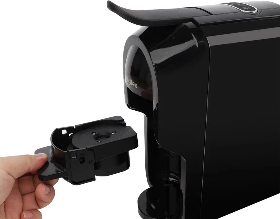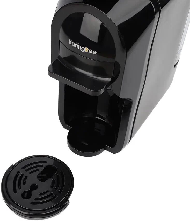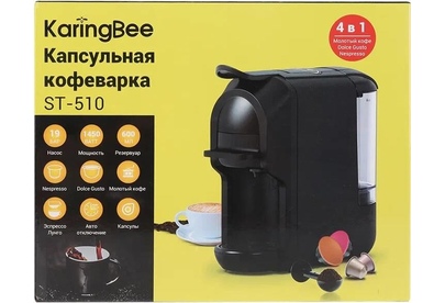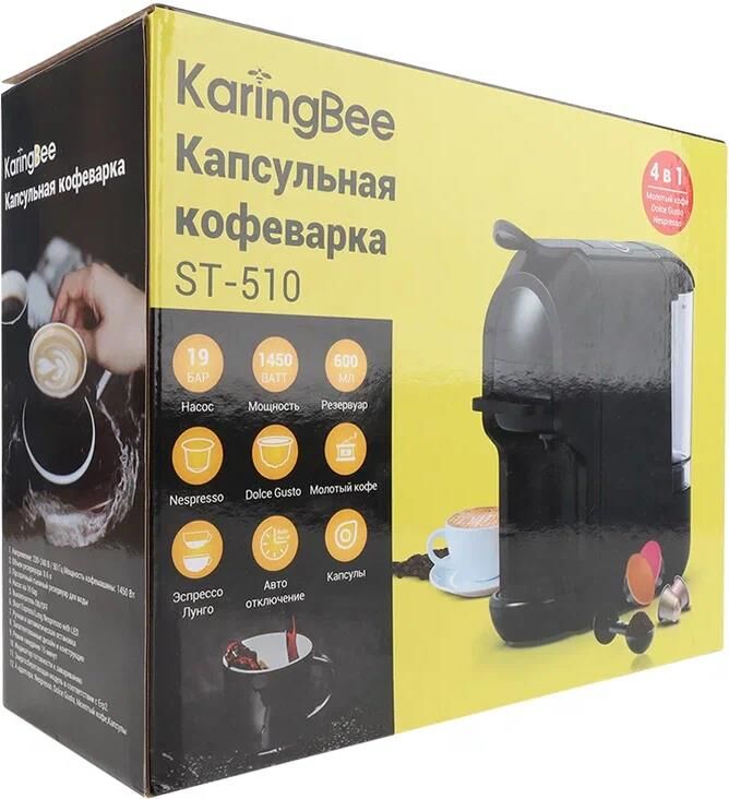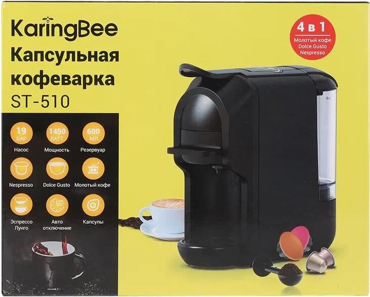KaringBee Кофемашина (черный) ST-510 Цвет товара черный Тип устройства кофемашина Тип капсульная Тип используемого кофе молотый/капсулы Тип капсул Dolce Gusto, Nespresso Original Мощность 1450 Вт Объем 0.7 л Давление помпы 19 бар Тип напитка американо, эспрессо Дополнительные функции автоотключение при неиспользовании Настройки нет Тип управления механическое Конструкция Фильтр постоянный Тип нагревательного элемента термоблок Материал корпуса пластик Особенности конструкции индикация работы, подсветка дисплея, съемный лоток для сбора капель, нет Умный дом Тип соединения устройств проводное Габариты и вес Глубина 28 см Ширина 11.5 см Высота 25 см Вес 2.75 кг
