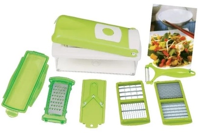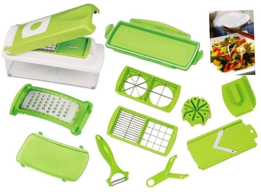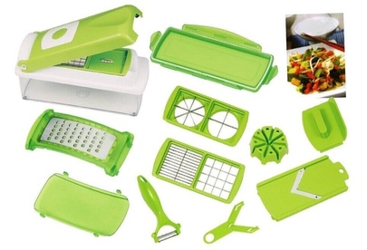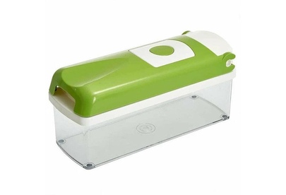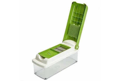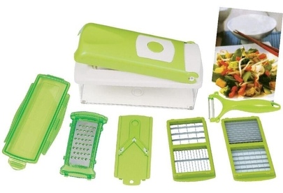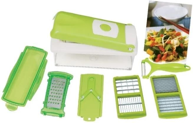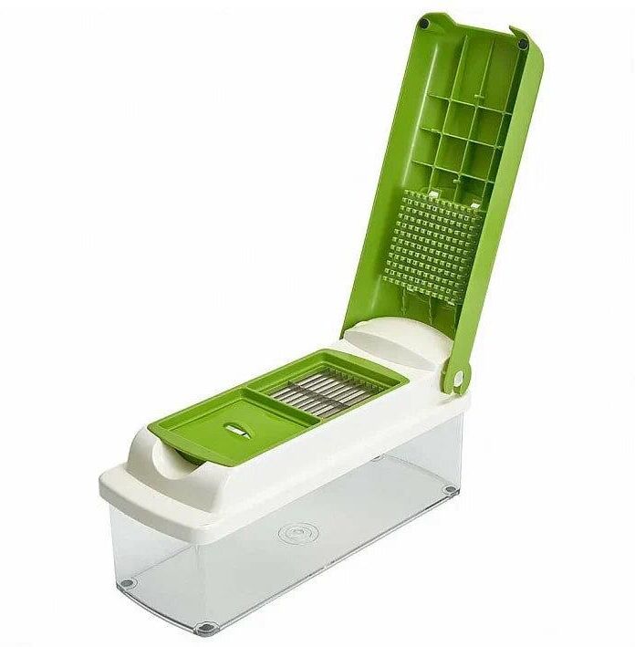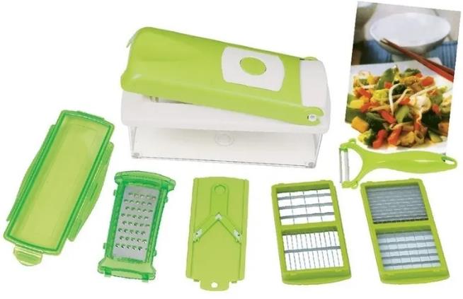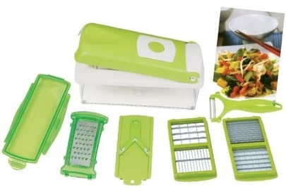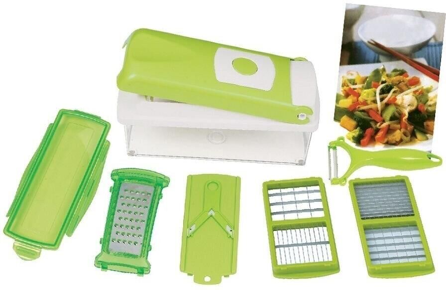 Овощерезка Найсер Дайсер Плюс Комплектация: Режущий элемент со встроенной решеткой Режущий нижний элемент Прозрачная приемная емкость (объем 1.500 мл) Крышка на приемную емкость Режущий вкладыш (6х6 мм или 12х12 мм) Режущий вкладыш (18х18 мм или 6х36 мм) Режущий вкладыш на 4 и/или 8 частей Съемная насадка для нарезки на 8 частей Защитная накладка на все режущие вкладыши Овощечистка
