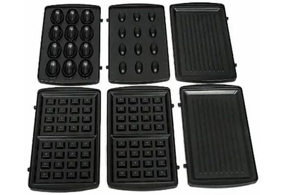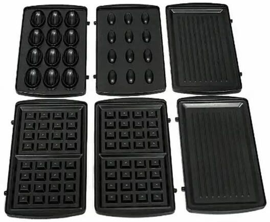 Мультипекарь Мощность: 1800 Вт индикаторы нагрева и готовности ;надёжный фиксатор крышки; материал корпуса металл+пластик; 3 пары съёмных металлических панелей с антипригарным покрытием: венские вафли, гриль, орешница Сеть: 220-240В, 50Гц,