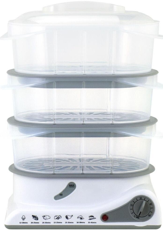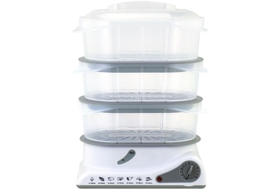 Электрическая пароварка; Мощность: 1100 Вт; Объём всех ёмкостей: 11 л; Таймер на 60 минут; Защита от нехватки воды; Управление: механическое; Материал корпуса: пластик, нержавеющая сталь; Нагревательный элемент из нержавеющей стали; Сеть: 220-240В, 50/60Гц,