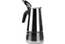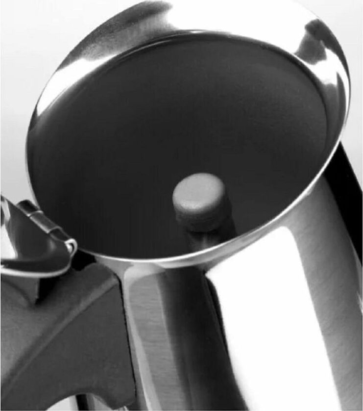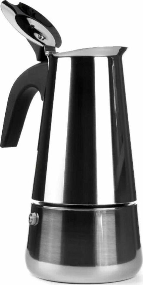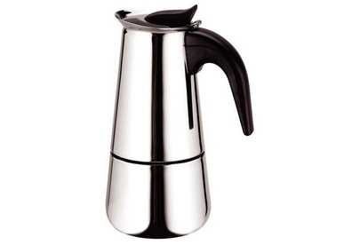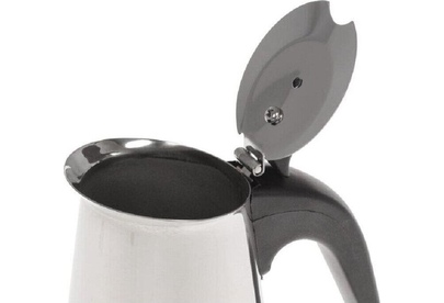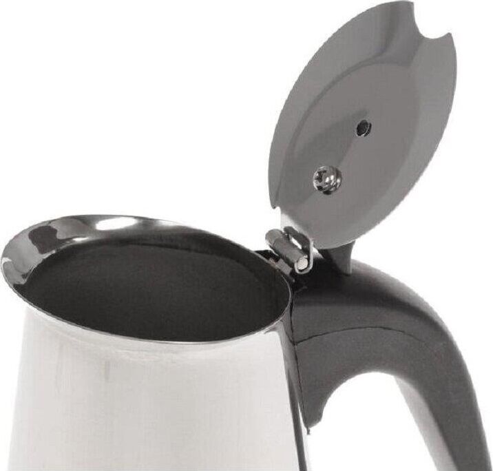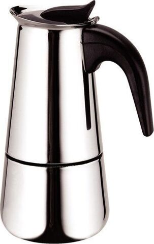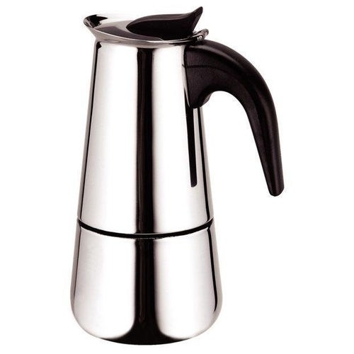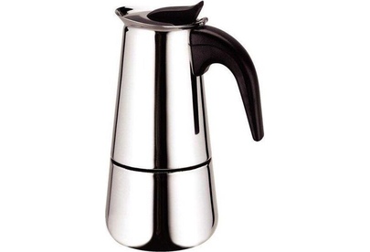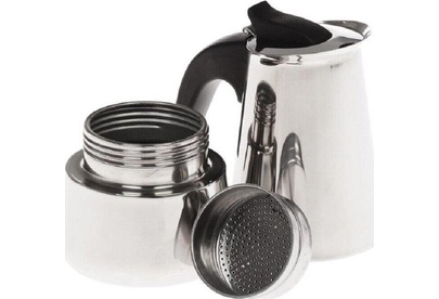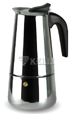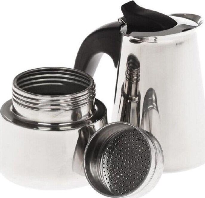 На 6 чашек. Нерж. сталь. Ручка и кнопка из нейлона (не нагреваются). Предохранительный клапан давления. Можно использ-ть на газ. плитах.Гейзер состоит из нижней емкости для воды, спец. сита-фильтра для кофе и верхнего чайничка для уже готового напитка.