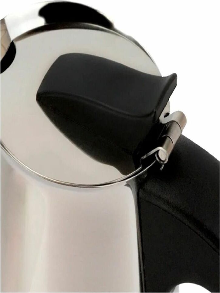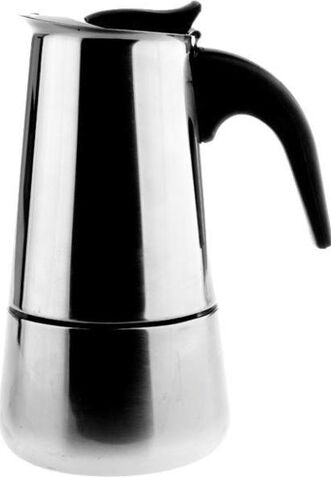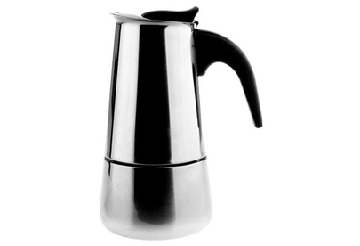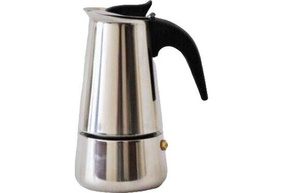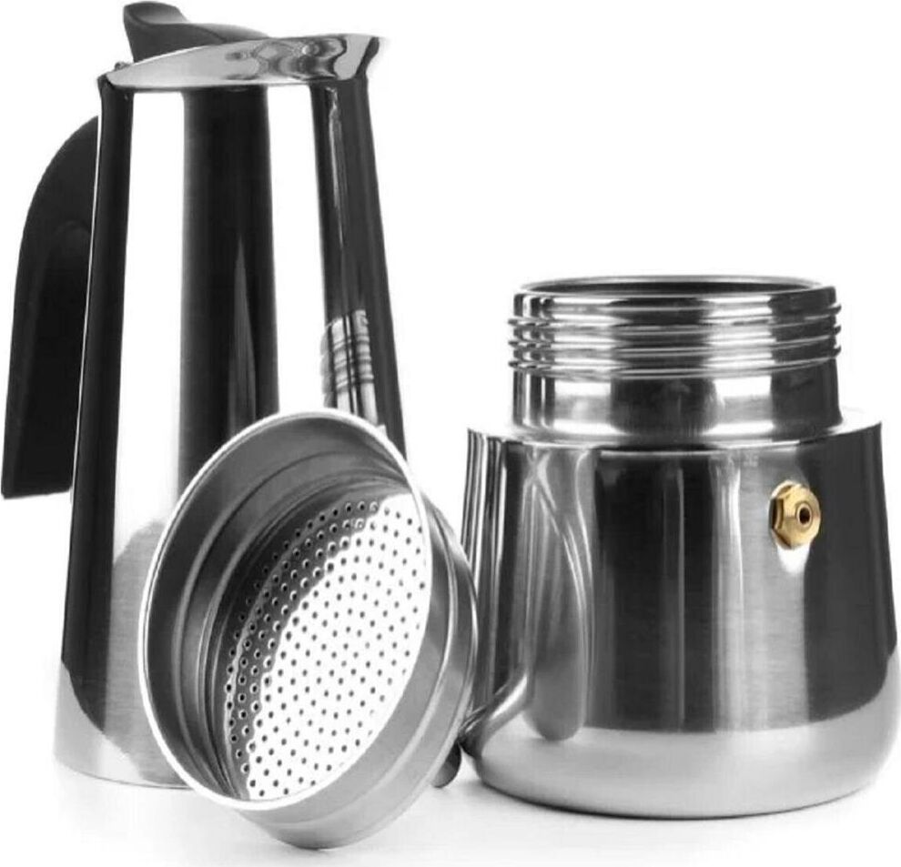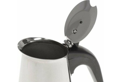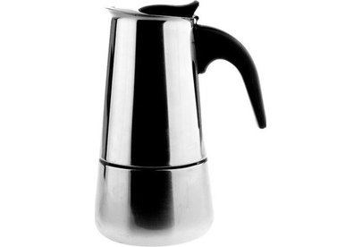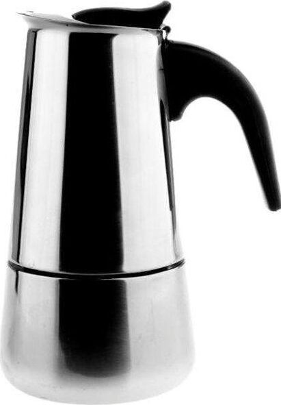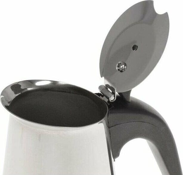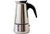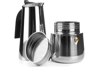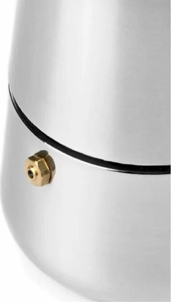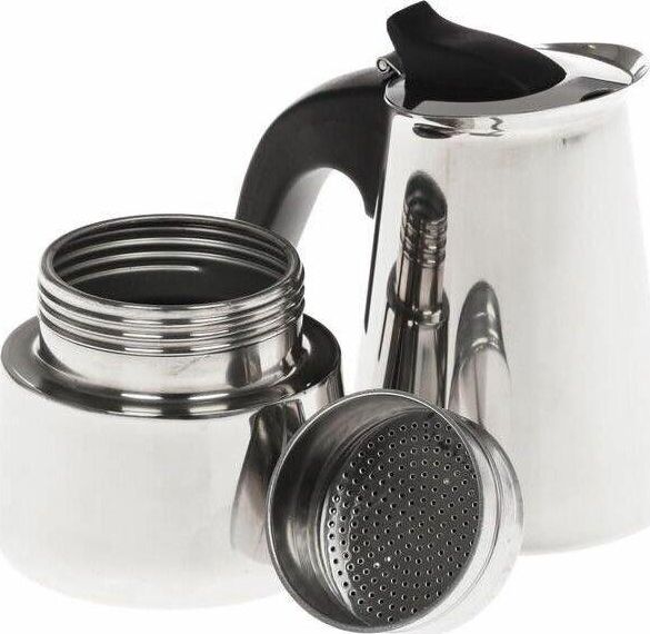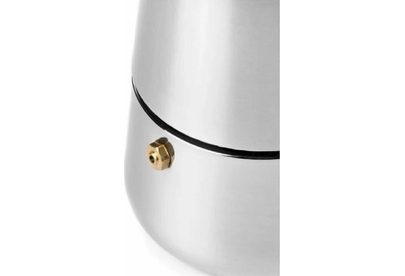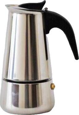На 9 чашек. Нерж. сталь. Ручка и кнопка из нейлона (не нагреваются). Предохранительный клапан давления. Можно использ-ть на газ. плитах.Гейзер состоит из нижней емкости для воды, спец. сита-фильтра для кофе и верхнего чайничка для уже готового напитка.