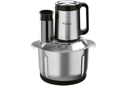 Чоппер-измельчитель 5в1 Мощность: 1500Вт Металлическая чаша: 2,8л 3 скоростных режима Двухъярусный нож с 4-мя лезвиями Насадки: диск-терка двусторонняя, насадка для взбивания яиц, насадка для замешивания теста, насадка для очистки чеснока Противоскользящее основание Ножи из нержавеющей стали Механическое основание Сеть: 220-240В, 50Гц