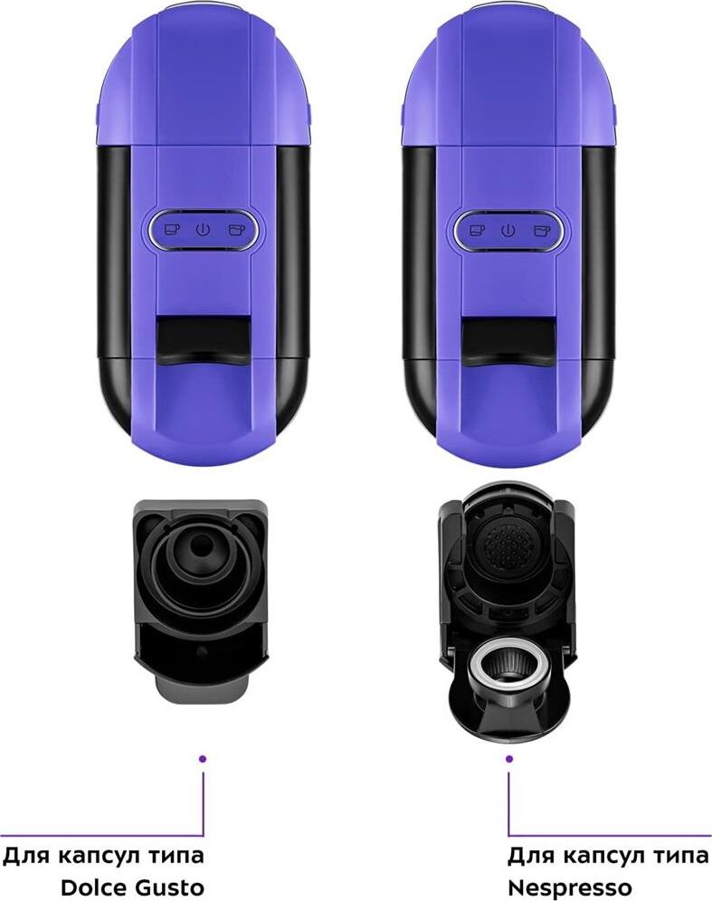 Мощность: 1450. Давление помпы: 19. Настройка размера порций: есть. Объем резервуара для воды: 0.6. Съемный дренажный отсек для капель: есть. Материал корпуса: пластик. Особенности: Кофеварка КТ-7105 - это многофункциональное устройство, сочетающее в себе функции капсульной и рожковой кофеварки. Она поможет приготовить кофе эспрессо, американо или лунго, а также множество других видов кофе на ваш вкус.. Тип капсул: Nespresso/Dolce Gusto. Вес: 3. Съемный резервуар для воды: есть. Габариты упаковки (ед) ДхШхВ: 0.32x0.145x0.28. Вес упаковки (ед): 3.52. Страна производства: Китай. Гарантия: 12 мес.. Размеры: 115 х 250 х 280 мм. Цвет: черный, фиолетовый. Капсулы: Nespresso/Dolce Gusto. Давление: 19 Бар. Мощность: 1450 Вт. Объем резервуара для воды: 0.6 л