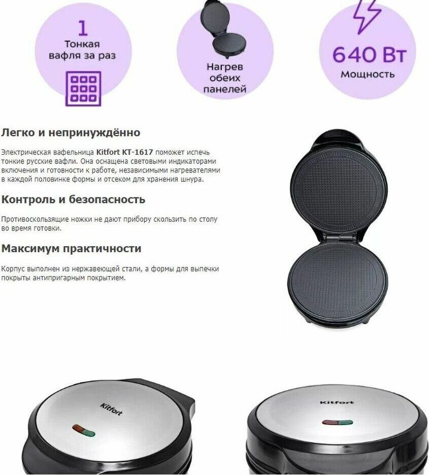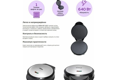 Мощность 700 Вт. Покрытие рабочих частей антипригарное. Антипригарное покрытие да. Форма нагревательных частей круглая. Формы для готовки пластины для вафель. Количество отделений в пластине для вафель 1. Индикатор включения есть. Индикатор нагрева есть. Материал корпуса нержавеющая сталь. Цвет серебристый и черный.