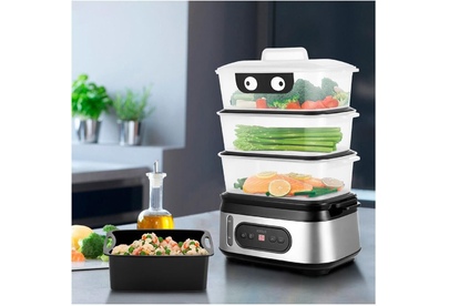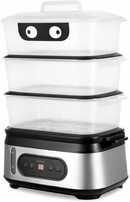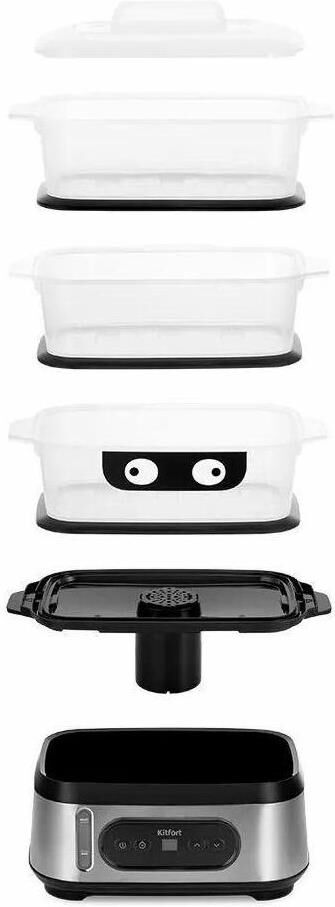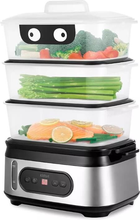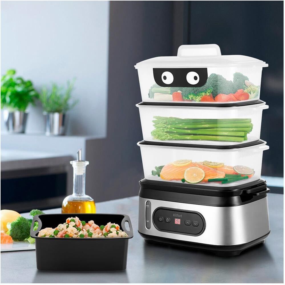Мощность 800-950 Вт Таймер приготовления до 90 мин с шагом 1 мин Время отложенного старта до 12 ч с шагом 1 ч Ёмкость резервуара для воды 1,5 л Ёмкость корзины 3 л Внутренний размер корзины 232 х 140 х 92 мм Ёмкость чаши для риса 1,5 л Размер чаши для риса 210 х 134 х 80 мм Ёмкость поддона 0,3 л Длина шнура 0,7 м Размер устройства 330 х 214 х 452 мм