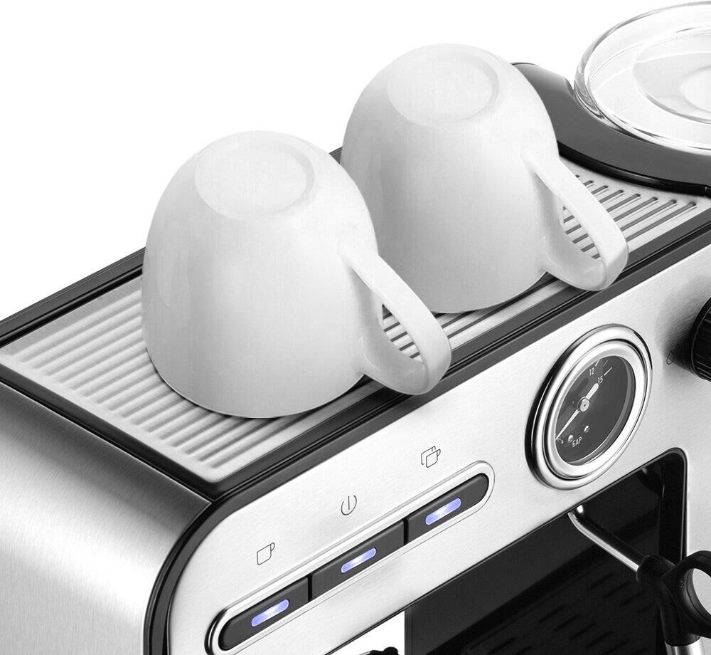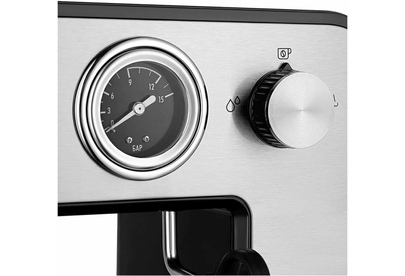 Тип кофеварки рожковая. Используемый кофе молотый. Тип нагревателя бойлер. Мощность 1450 Вт. Давление помпы 15 Бар. Резервуар для воды 1 л. Тип управления электронное. Встроенный манометр есть. Материал корпуса металл/пластик. Цвет серебристый. Размеры (ШхВхГ) 38.5 х 26.1 х 13.6 см. Вес товара 3.4 кг. Длина сетевого кабеля 0.9 м.