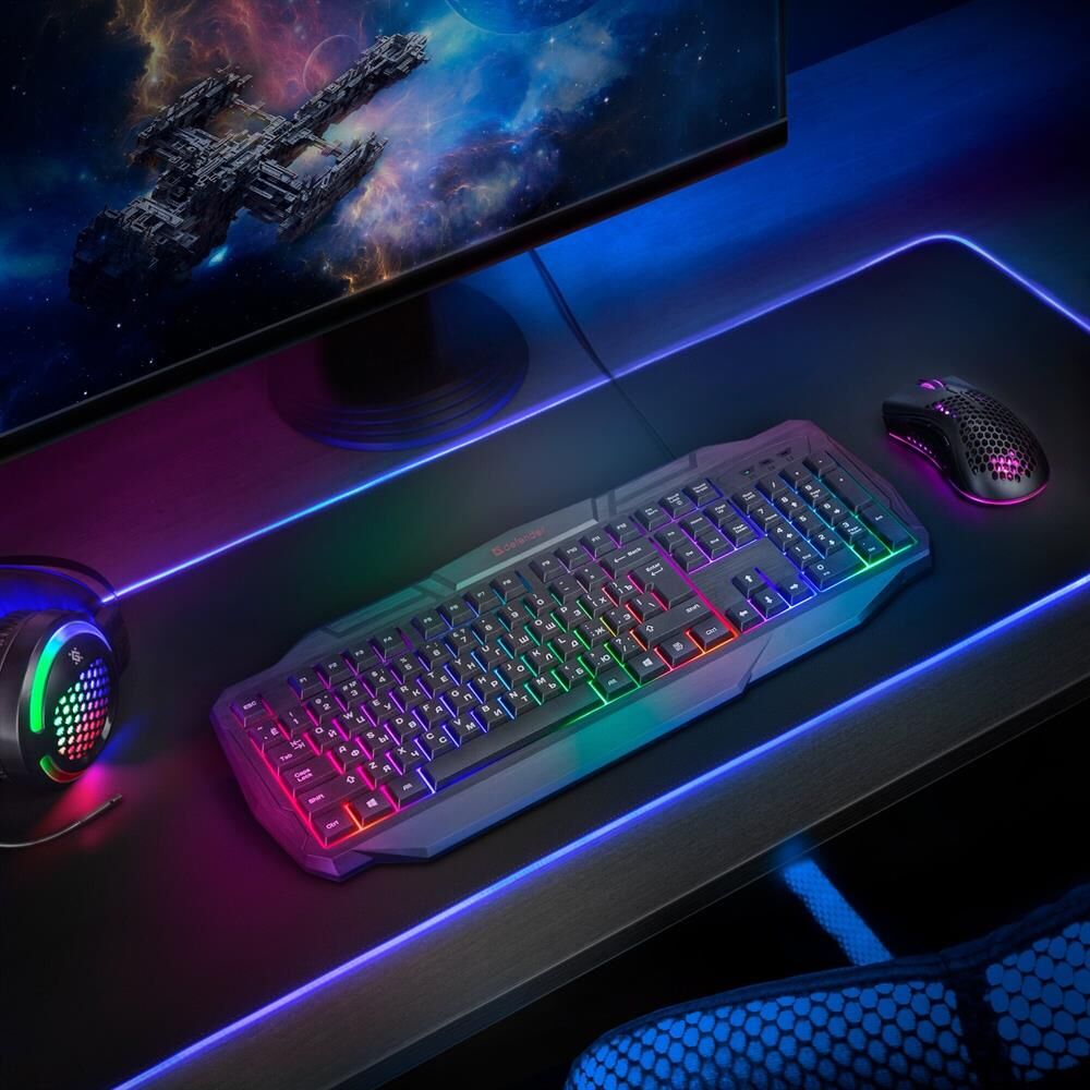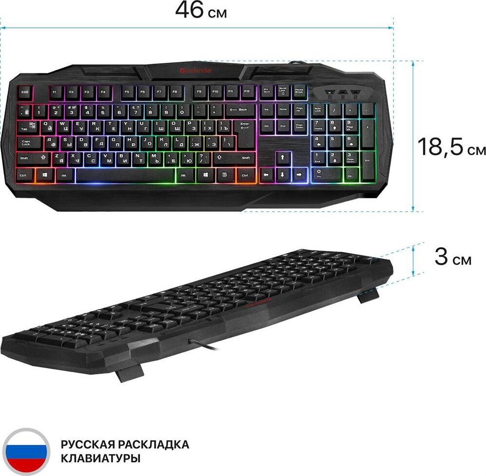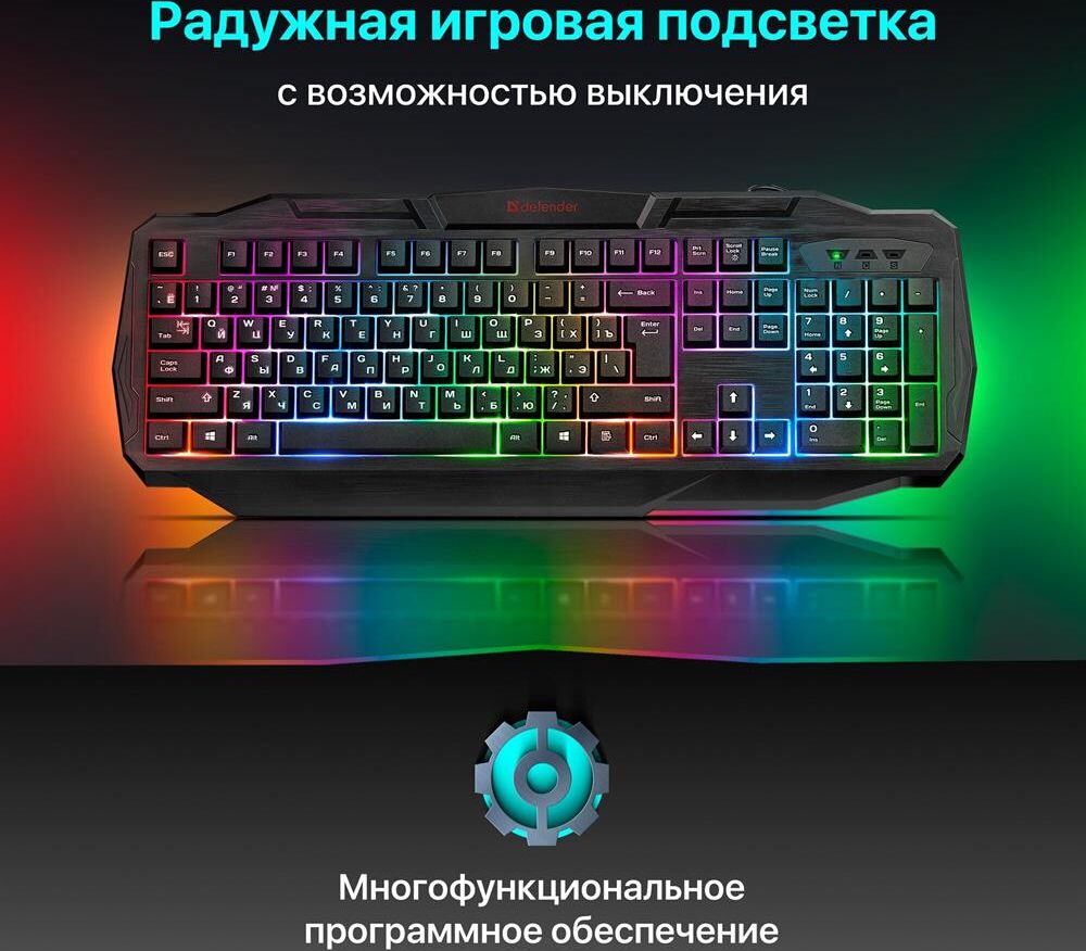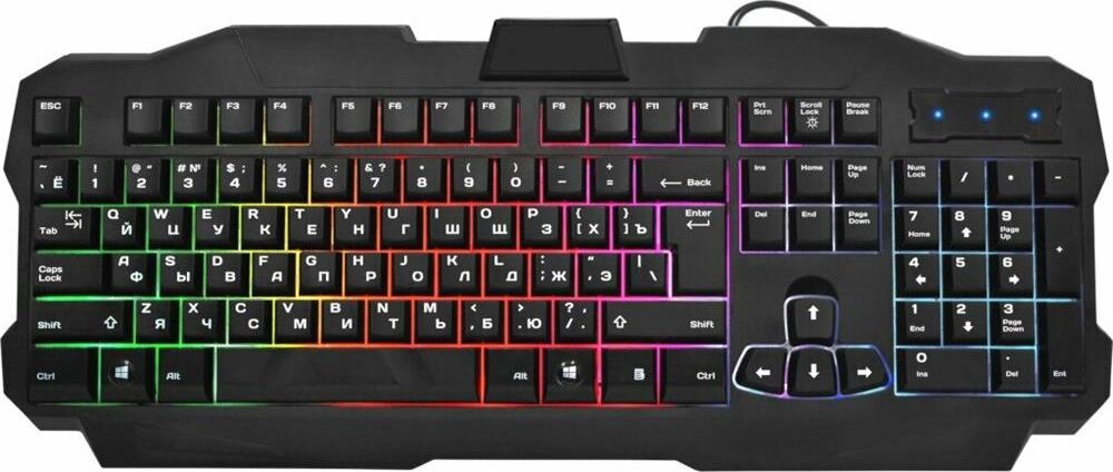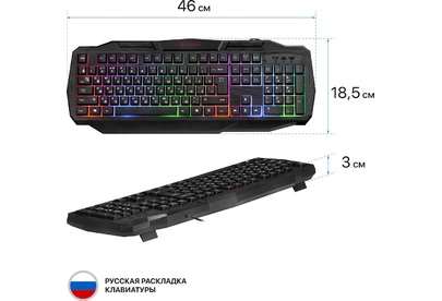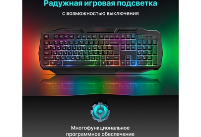 Системные требования для ПК Windows 2000/XP/Vista/7/8/10, Mac OS X10.Цвет языка основной раскладки белый. Прочная усиленная конструкция продлевает срок службы клавиатуры. Полноразмерная раскладка клавиш. Легкая установка. Для работы не нужны драйверы. Радужная подсветка. Возможность выключения подсветки. Угол наклона клавиатуры регулируется с помощью ножек. Многофункциональное программное обеспечение.