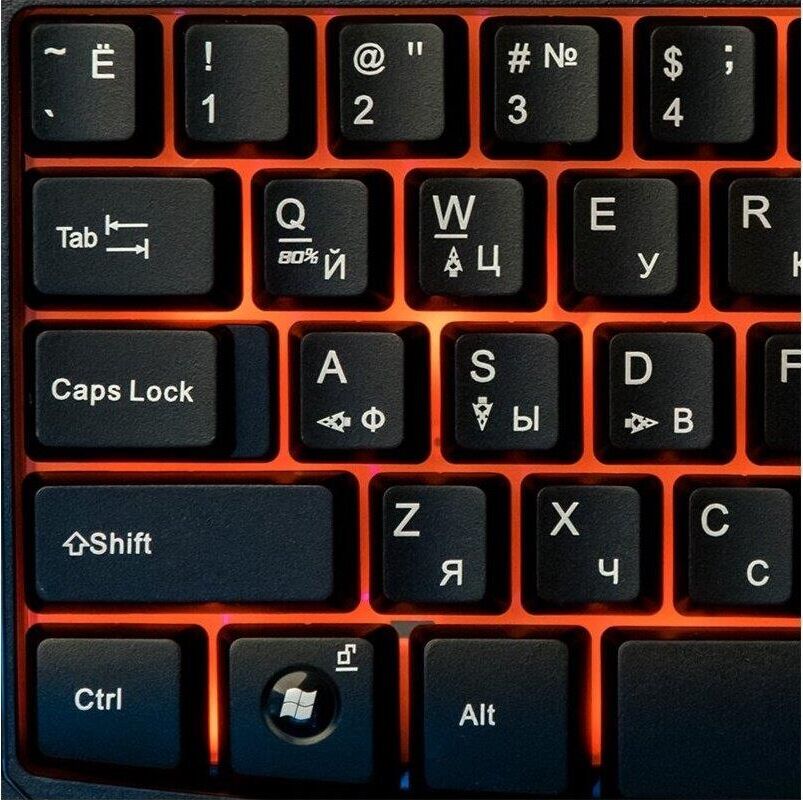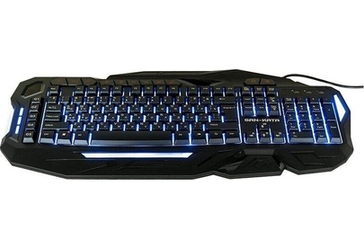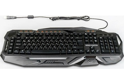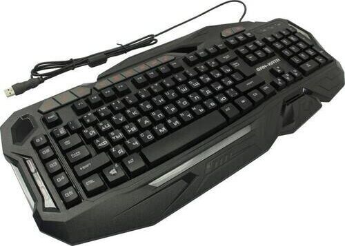 Мультимедийная игровая клавиатура с подсветкой клавиш, проводная, интерфейс - USB, корпус - черный текстурированный пластик, количество клавиш - 120, клавиши Windows, мультимедиа-клавиши - блок в верхнем ряду над F-клавишами, 3 уровня яркости подсветки, регулируемый угол наклона, кабель с ферритовым фильтром, длина кабеля - 2,0 м, габаритные размеры (В*Ш*Г, мм) - 515*215*32