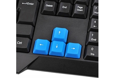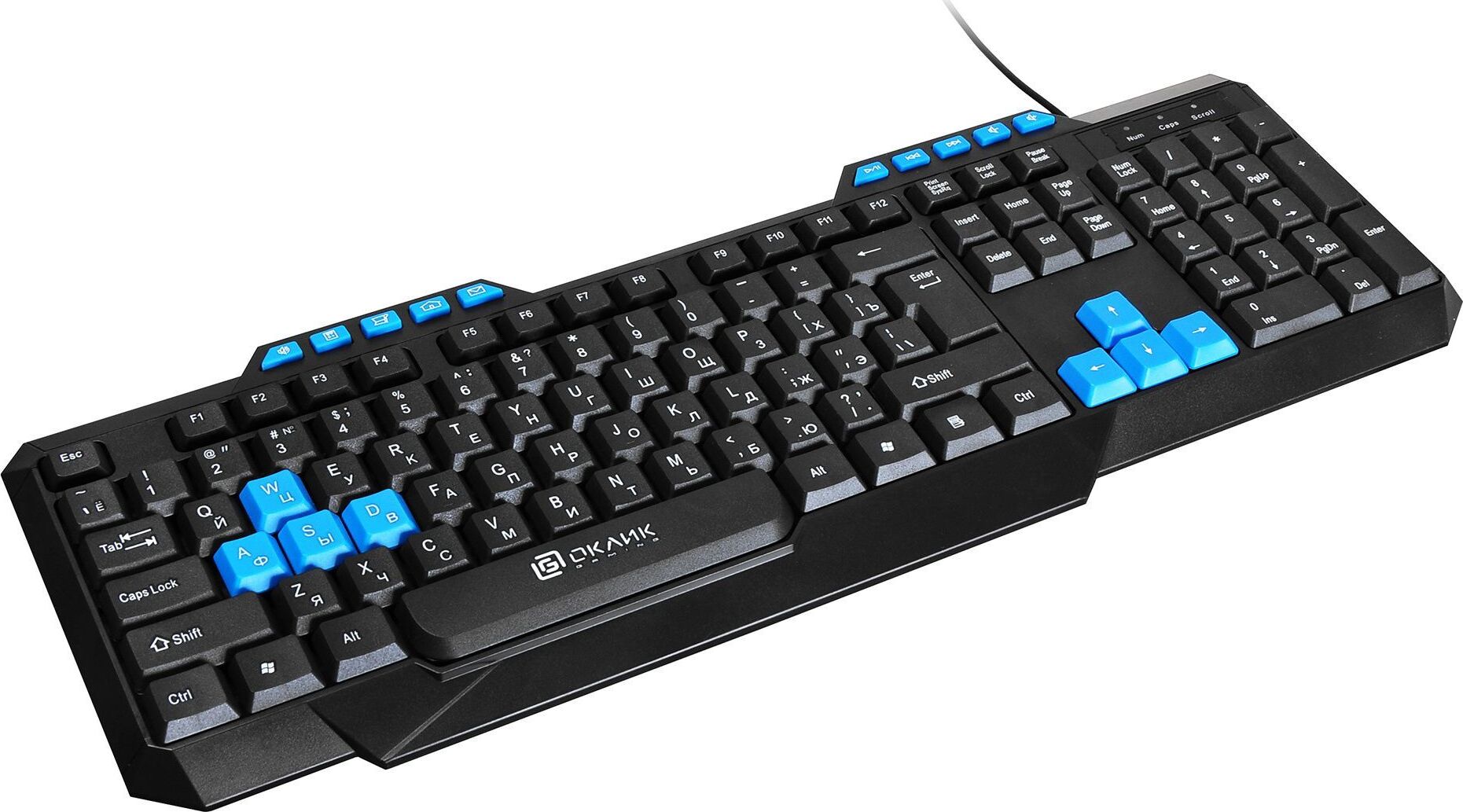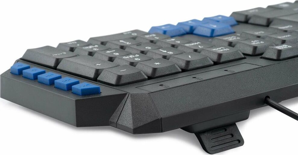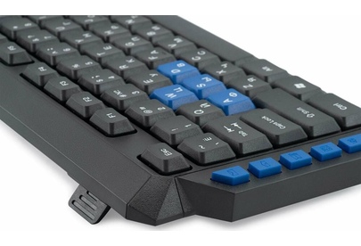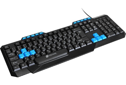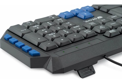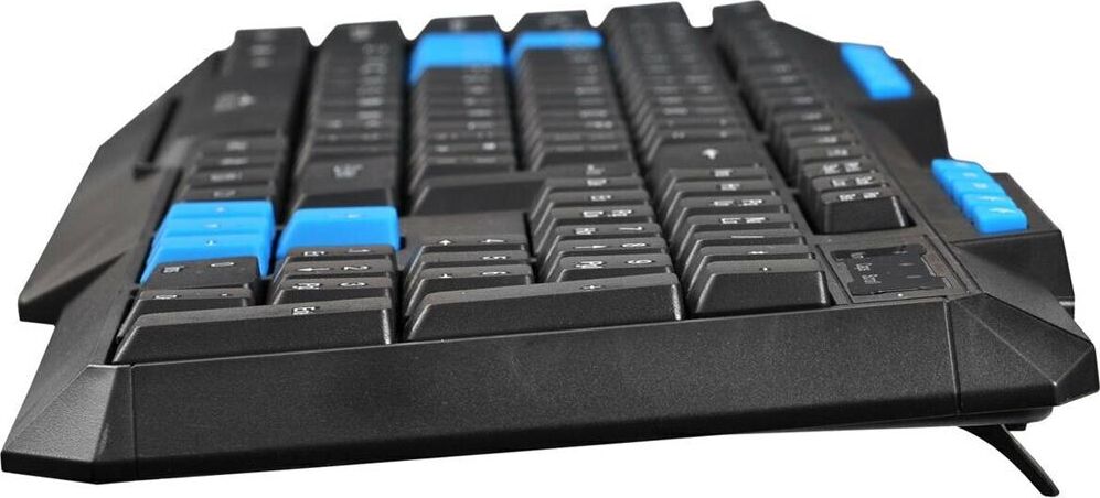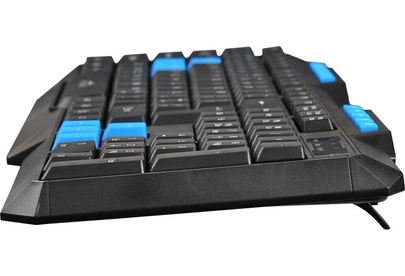 Клавиатура игровая, проводная, мультимедийная, количество клавиш: 114, дополнительных - 10, часто используемые клавиши - выделены голубым цветом, интерфейс USB, корпус клавиатуры - имеет изогнутую форму, ножки прорезинены, длина кабеля: 1,5 м, размер: 450 x 155 x 25 мм.