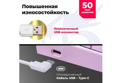 Повышенная износостойкость Позолоченный USB-коннектор - Позолоченное напыление обеспечивает лучшую проводимость, меньшее сопротивление и окисляемость Радужная подсветка Технология Hot Swap Влагоустойчивая конструкция клавиатуры Тихий ход клавиш обеспечивает практически бесшумную работу