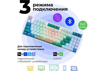 Клавиатура, Тип подключения беспроводной Bluetooth, беспроводной радио. Количество клавиш 94 . Количество нажатий 50 миллионов . Цвет белый + зелёный. Длина кабеля 1.5 ±5% м. Совместимость Windows 2000/XP/Vista/7/8/10 и выше, Mac OS X10 Тип элемента питания Li-polymer. Емкость батареи 1600 мА. Время работы от аккумулятора 10-80.