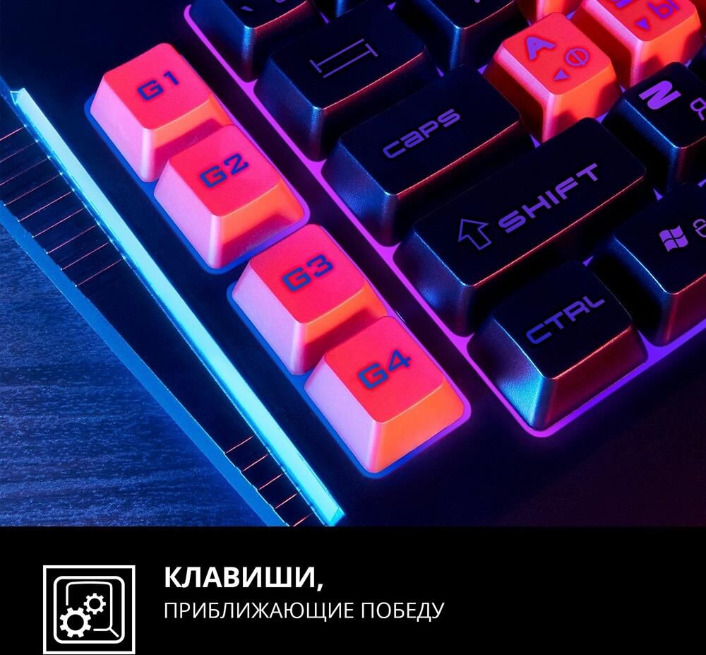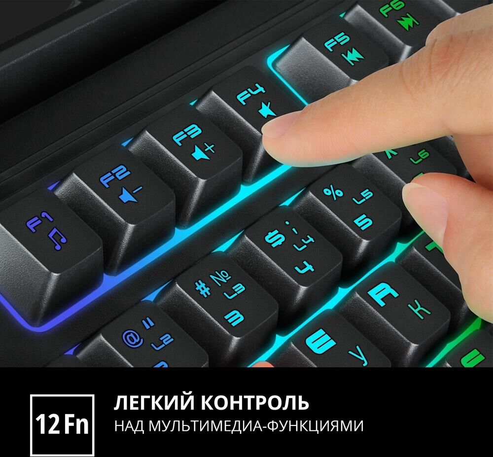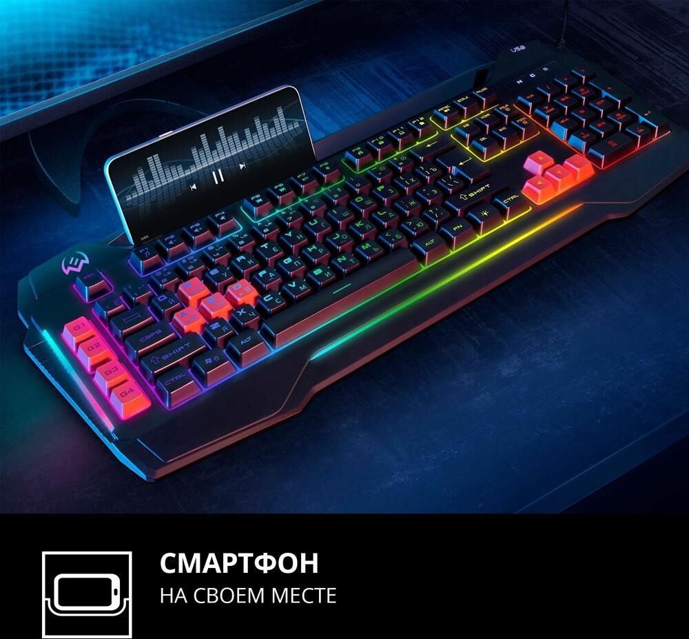 Программируемые клавиши для настройки макросов 12 мультимедийных (Fn) клавиш Совместимость с ОС Windows Раскладка клавиатуры Рус/Укр/Eng Раскладка кириллицы Windows Количество клавиш 109 Кол-во клавиш быстрого доступа, шт. 12 Интерфейс USB Наработка на отказ, нажатий свыше 20 000 000 Тип мембранная Соответствие стандартам FCC, CE, ЕАС Настраиваемая RGB-подсветка Встроенная подставка для смартфона
