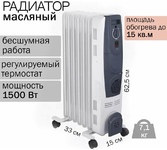 Мощность 1500 Вт. 7 секций. Регулируемый термостат. Регулировка мощности. Защита от перегрева. Световой индикатор работы. Колесики для перемещения. Место для хранения шнура.