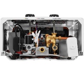Номинальная мощность 28 кВт. Коэффициент полезного действия 84%. Расход воды при нагреве на 25°С 11 л/мин. Минимальный проток воды для работы 2,5 л/мин. Количество точек водоразбора 2-3. Напряжение сети 220В, 50Гц. Потребление электричества при работе 50Вт. Вертикальный монтаж на стену с нижней подводкой. Размеры (ВxШxГ) 650x440x190 мм. Электронное зажигание. Светодиодный дисплей.