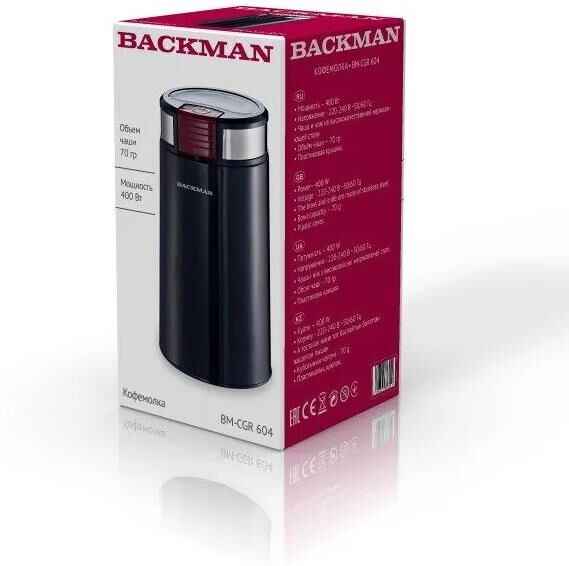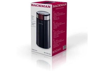 Кофемолка BACKMAN BM-CGR 604 400 W , Кофемолка 400 W, вместимость 70 г. Пульсовый режим работы, блокировка включения при снятой крышке, пластиковая крышка, чаша и нож из высококачественной нержавеющей стали, защита от перегрева.