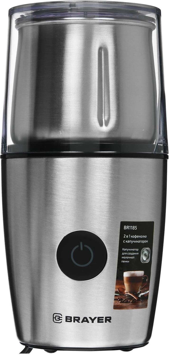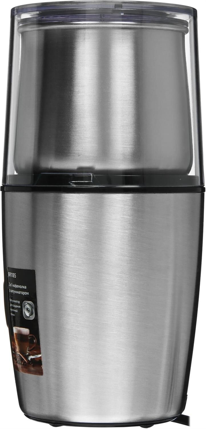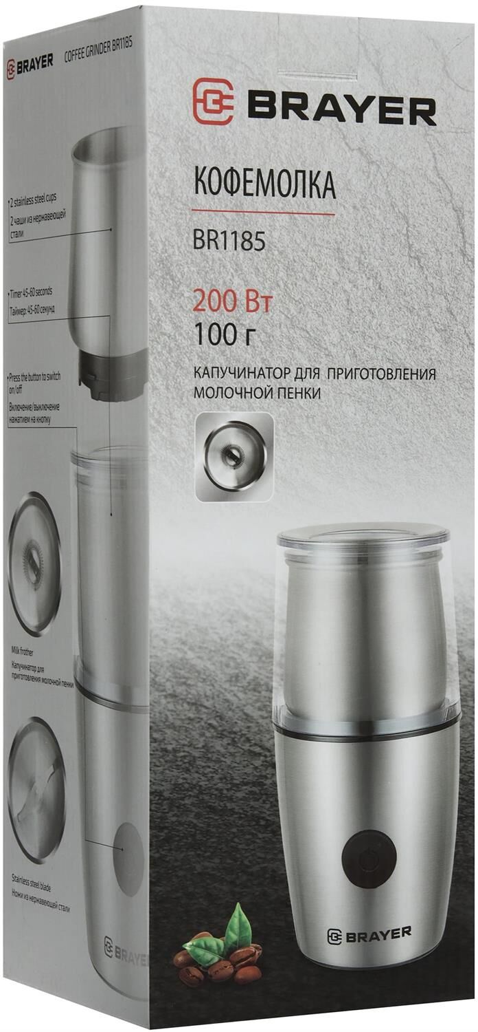Мощность кофемолки 200 Вт Мощность капучинатора 20 Вт Емкость кофемолки 100 грамм Емкость капучинатора 140 мл Ножи из нержавеющей стали 2 чаши из нержавеющей стали Таймер (45 сек для кофемолки, 60 сек для капучинатора) Включение/выключение нажатием на кнопку