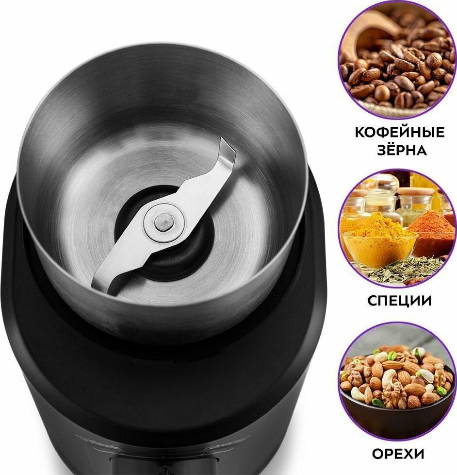 Система помола ротационный нож. Мощность 200 Вт. Вместимость 70 г. Максимальная скорость вращения 23000 об/мин. Регулировка степени помола есть. Количество степеней помола 5. Возможность помола специй есть. Блокировка включения при снятой крышке есть. Прорезиненные ножки есть. Длина сетевого кабеля 0.7 м. Цвет черный.